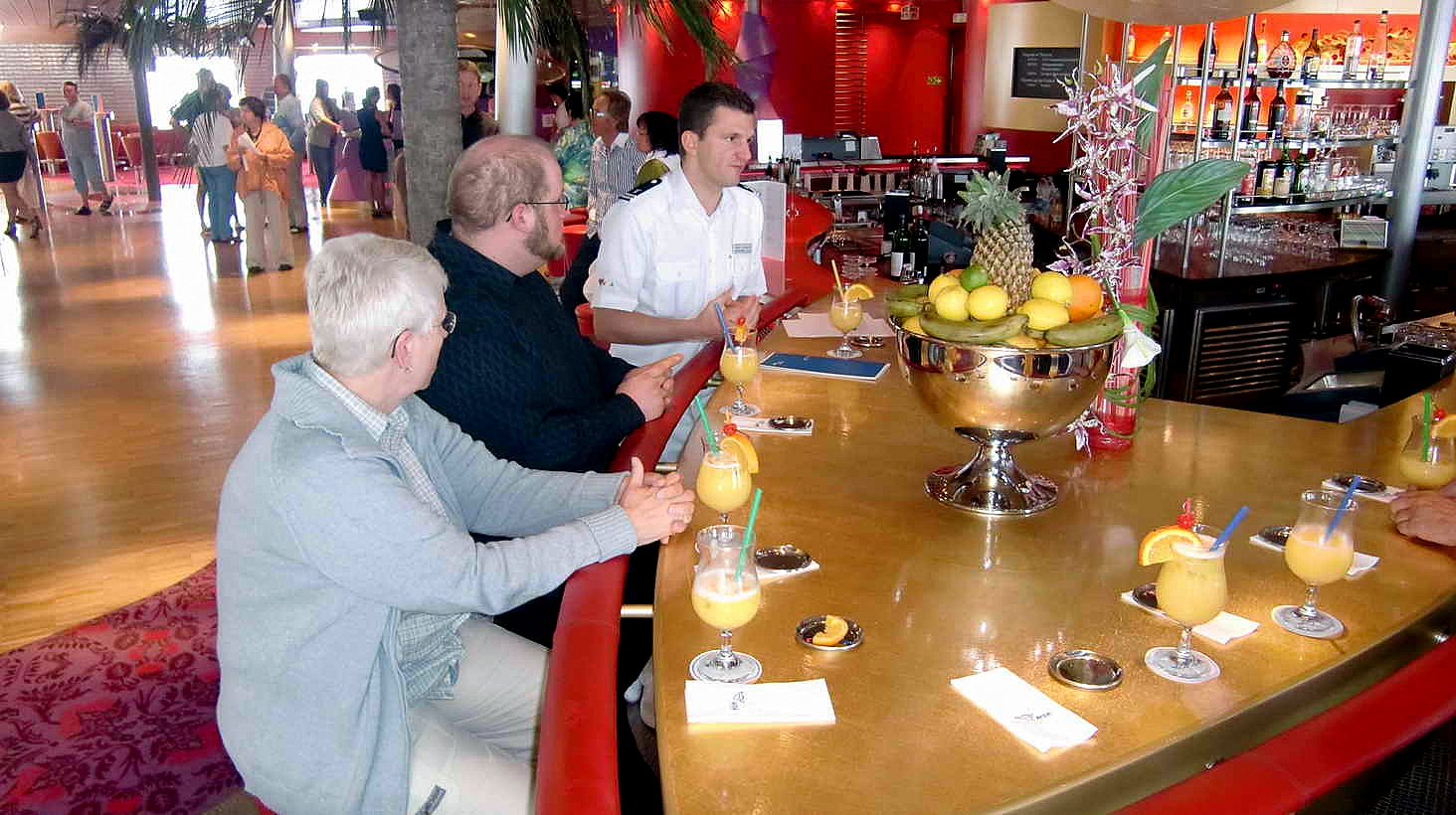 Gegen 10 Uhr 15 ist es dann soweit, wir melden uns beim Reiseservice Mitar- beiter Florian Eberhardt, der die Anwesenheitsliste führt. An der Bar erhalten wir ein Getränk (ohne Alkohol) und eine kurze Einführung in den Ablauf der „Veranstaltung“. Wichtigster Punkt: Fotografieren und Filmen verboten. An- sonsten werden wir über viele Decks zu den unterschiedlichsten Stellen ge- langen und der gesamte Rundgang wird ca. 3 Stunden dauern. Das ist schon mal toll, mit einem so langen Rundgang hatten wir nicht gerechnet.