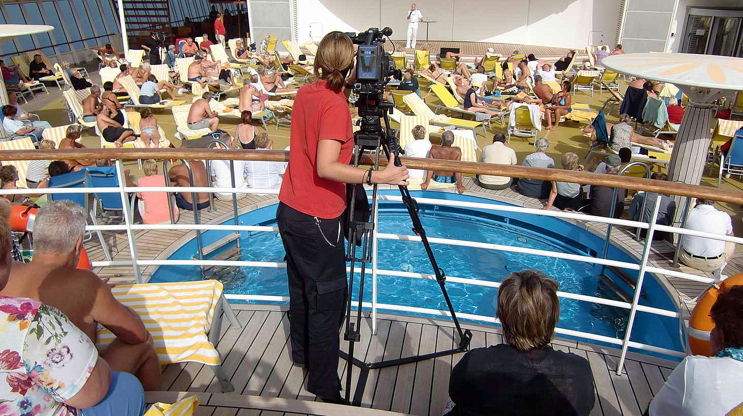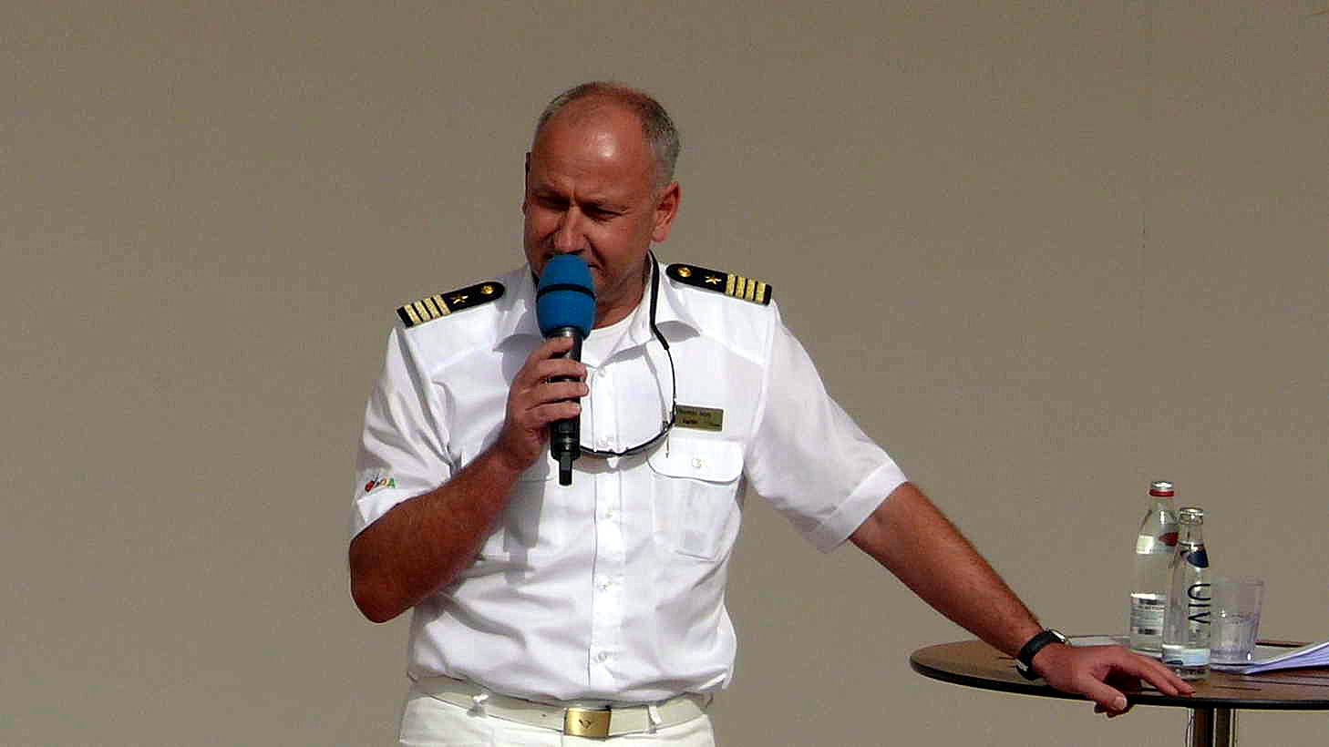 Da Elke heute noch ein weiteres Mal an der Kreativ- werkstatt „Malen“ teilnehmen möchte, beeilen wir uns mit dem Kaffee trinken um 15 Uhr im Weite Welt Res- taurant. Elke begibt sich danach auf Deck 6, während ich mir von 16 bis 17 Uhr die Fragestunde des Kapitäns auf dem Pooldeck ansehe und anhöre. Ich bekomme doch noch die eine oder andere Sache mit, die ich bisher nicht wusste oder kannte.