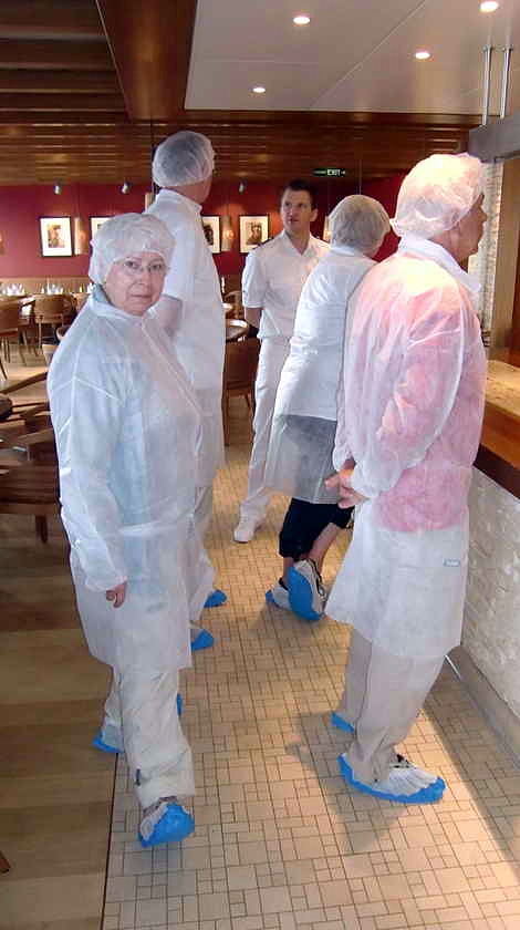 Von hier aus gelangen wir über eines der 16 nichtöffentlichen Treppenhäuser zum Buffalo Restaurant. Einer der Küchenchefs nimmt uns in Empfang. Als betriebsfremde Personen müssen wir jetzt einen Schutzkittel, eine Haube für die Haare und Überzieher für die Schuhe anlegen, eine sehr amüsante Sache. Weil es hier noch ein öffentlicher Bereich ist, wir sind noch im Restaurant, können wir uns auch gegenseitig fotogra- fieren. Dann betreten wir die relativ kleine Küche des Buffalo Restaurants.