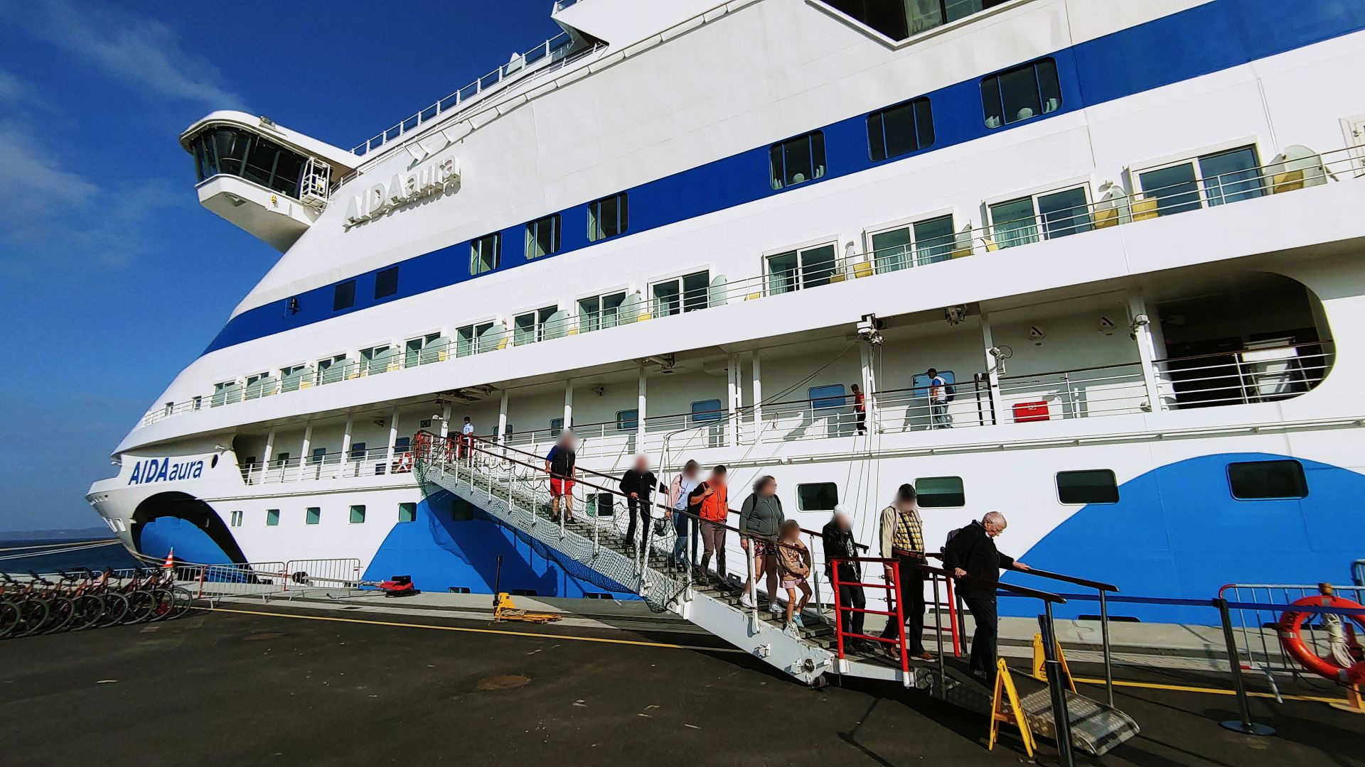 Um 16 Uhr 15 sind wir zurück am Bus und um 17 Uhr 30 wieder auf dem Schiff. Vor dem Schiff steht ein Männerchor (10 Personen) und schmettert tolle Lieder zur Abfahrt der Aidaaura. Wir sehen einen Augenblick zu und Elke geht schon an Bord. Ich fotografiere und filme noch kurz. Dann gehe ich auch an Bord. Nach einem Erdbeershake in der Oceanbar gehen wir zum Abendessen ins Calypso.