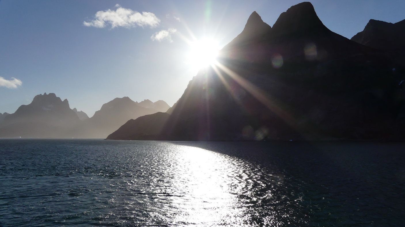 Mit Elke tausche ich öfter die Deckseite, so kann jeder die besten Bilder seiner Seite machen. Bei der Einfahrt ist der Himmel noch zu 99% bewölkt, aber ab und zu blinzelt die Sonne schon durch die Wolken. Was dann folgt ist einfach ein grandioser Tag. Die Sonne bahnt sich immer mehr ihren Weg durch die Wolken und wir erleben eine wunderbare Durchfahrt durch den Prinz-Christian-Sund. Gleich links nach der Einfahrt kann man eine dänische Wetterstation sehen. Die Meteorologen führen hier ein sehr einsames Leben.
