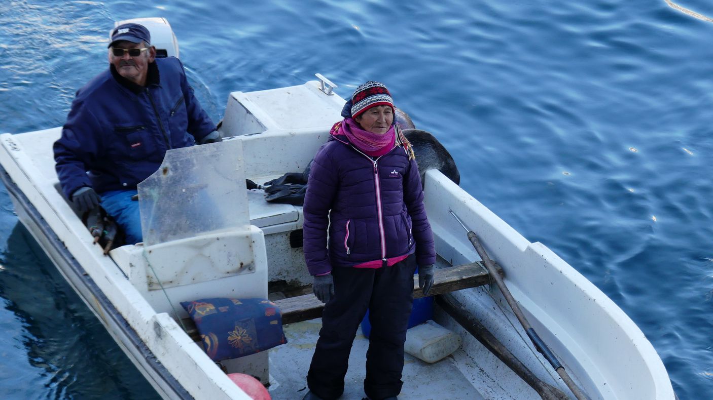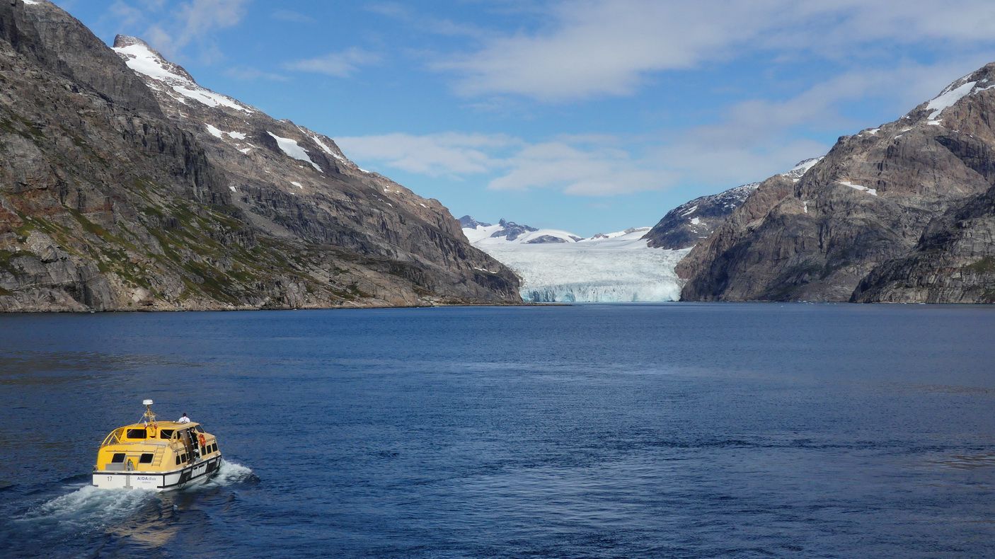 Als sie sich der Aidadiva weit genug genähert haben winken sie uns zu und viele Kreuzfahrtgäste winken auch zurück. Sie fahren mit ihrem kleinen Boot einige Male an der Aidadiva hin und her und verschwinden dann wieder irgendwo im Prinz-Christian-Sund. Vielleicht stammen sie aus der Siedlung Aappilattoq, an der wir im weiteren Verlauf des Tages noch stoppen werden.