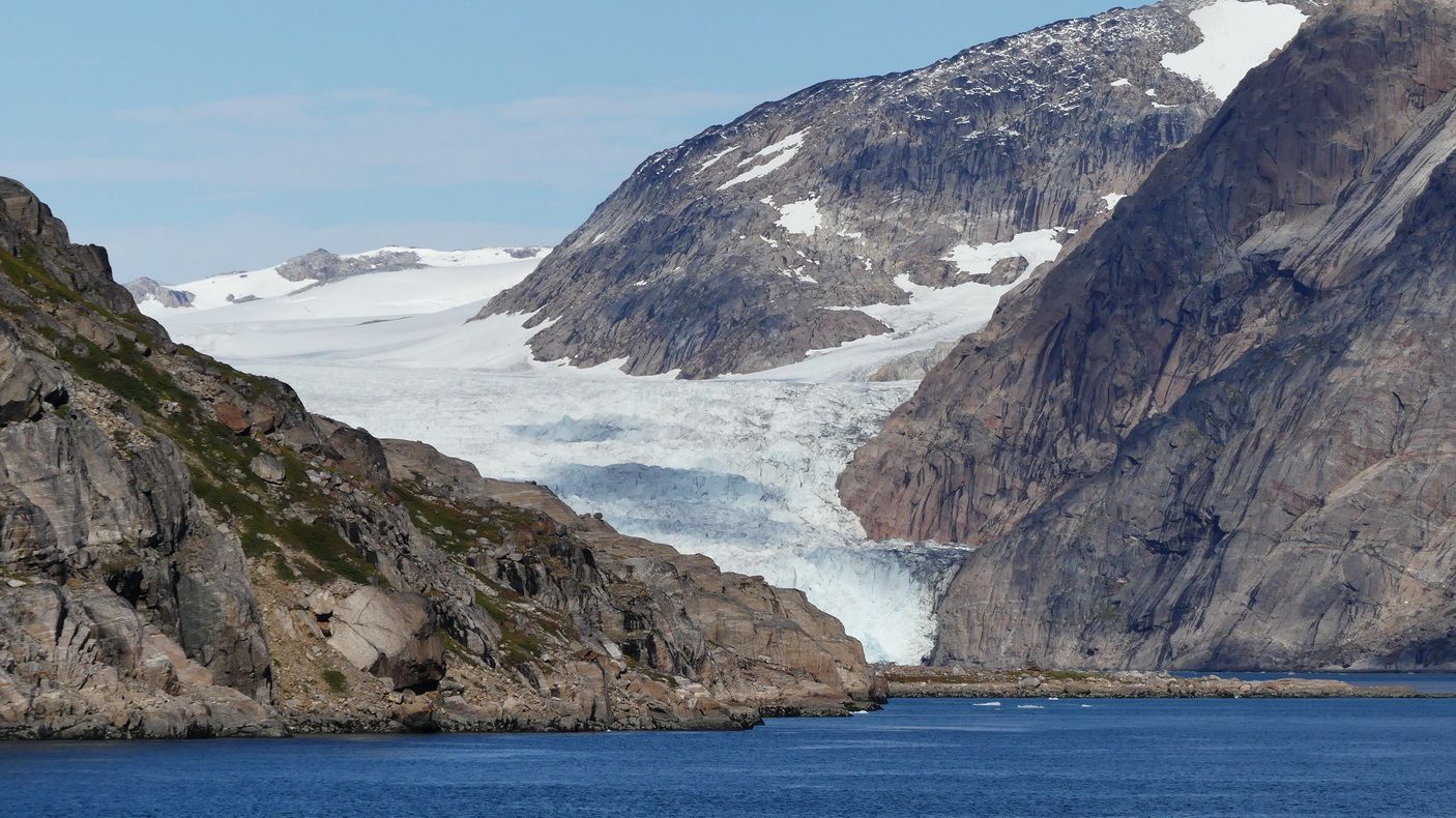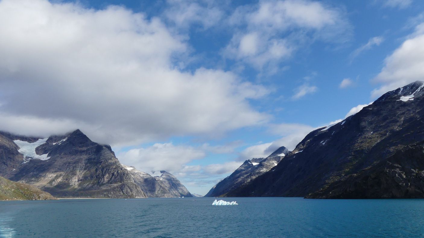 Schon gleich nach der Einfahrt entdecken wir die ersten kleinen und mittelgroßen Eisberge. Da nur 10-20% über Wasser zu sehen sind kann man sich die Größe unter Wasser gut vorstellen. Teilweise kann man richtige Formen wie z.b. Schwäne o.ä. erkennen. Viele Eisberge sind auch bedingt durch Ebbe und Flut am Rand des Prinz-Christian-Sunds gestrandet. Nach einer Weile erreichen wir dann die ersten Gletscher, die sich vom der Grönland- Eiskappe, die fast die ganze Insel bedeckt, bis hinunter an den Sund erstrecken. Beeindruckend. Man kann diese Anblicke gar nicht richtig in Worte fassen. Viele der Felsen rechts und links sehen aus, als ob sie von Gletschern richtig glatt geschliffen worden sind.