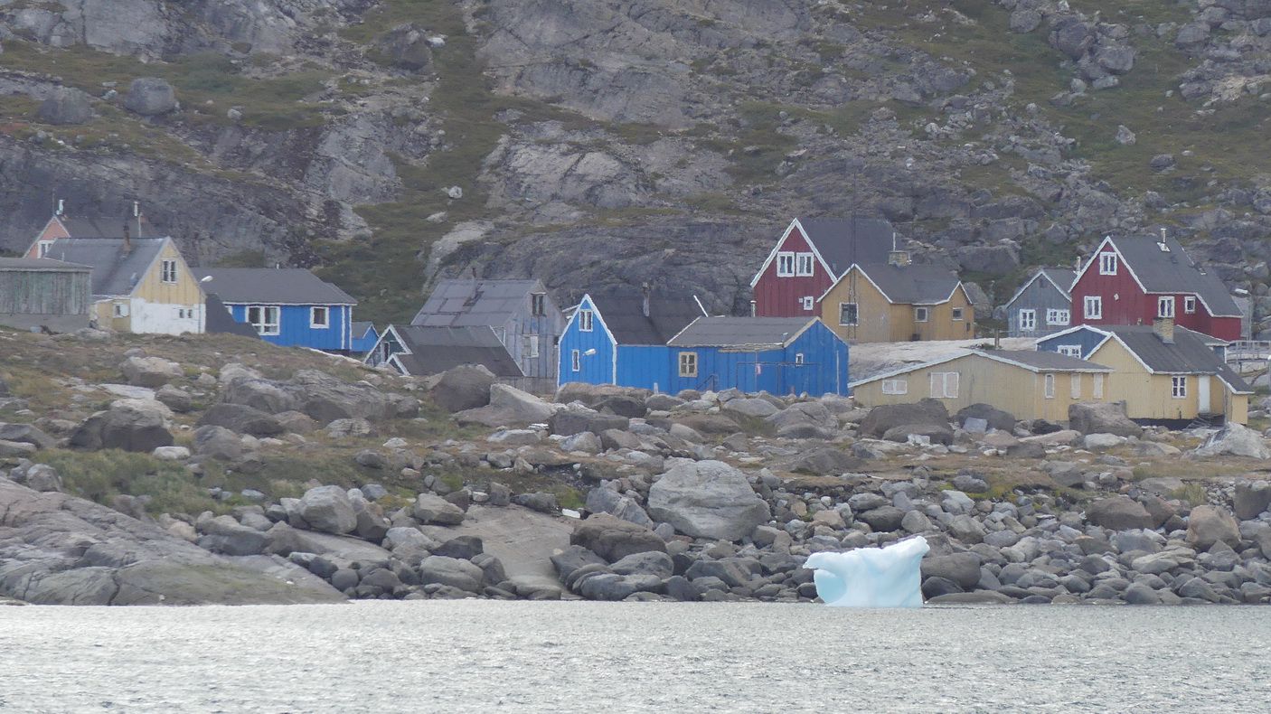 Nach einigen scharfen Kurven, die die Aidadiva in langsamer Fahrt sicher meistert, erreichen wir die Siedlung Aappilattoq. Hier leben heute etwa 180 Personen, hauptsächlich von Fisch-, Robben- und Walfang. Es gibt sogar eine Schule im Ort und ein Postamt. Die Holzhäuser sehen alle sehr bunt aus und besitzen teilweise sogar Solarpanele. Wir entdecken aber auch eine Sattelitenanlage und Tanks, die wahrscheinlich Öl bzw. Treibstoff enthalten.