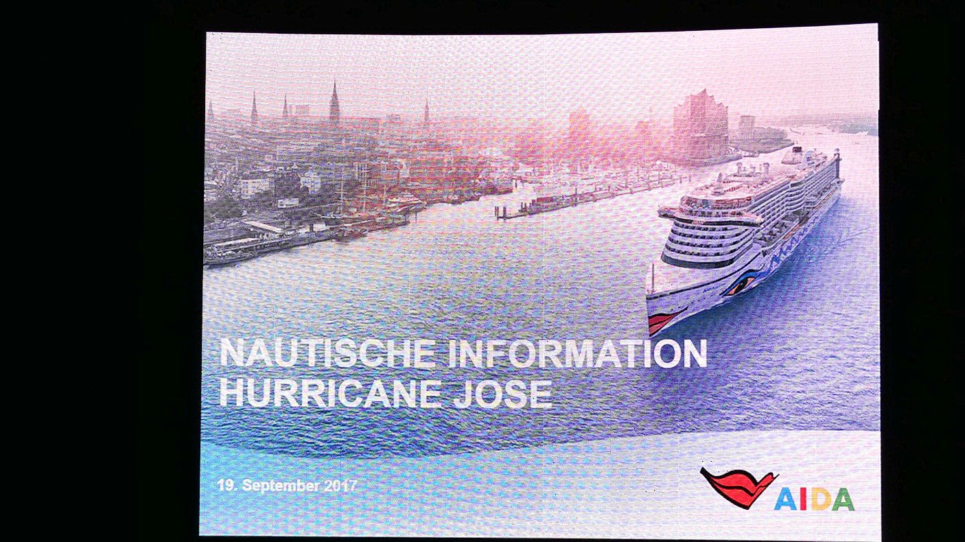 Die Infoveranstaltung ist sehr gut besucht und bringt einige neue, detailliertere Infos. Der Hurrikan Jose bringt auf seiner Zugbahn kurze, heftige Wellen mit mindestens 6-8 m von Nord nach Süd mit sich. Diese kurzen, brechenden Wellen sind ein Problem für das Schiff. Daher bleibt es im Hafen. Außerdem sind in dem Gebiet einige Untiefen.