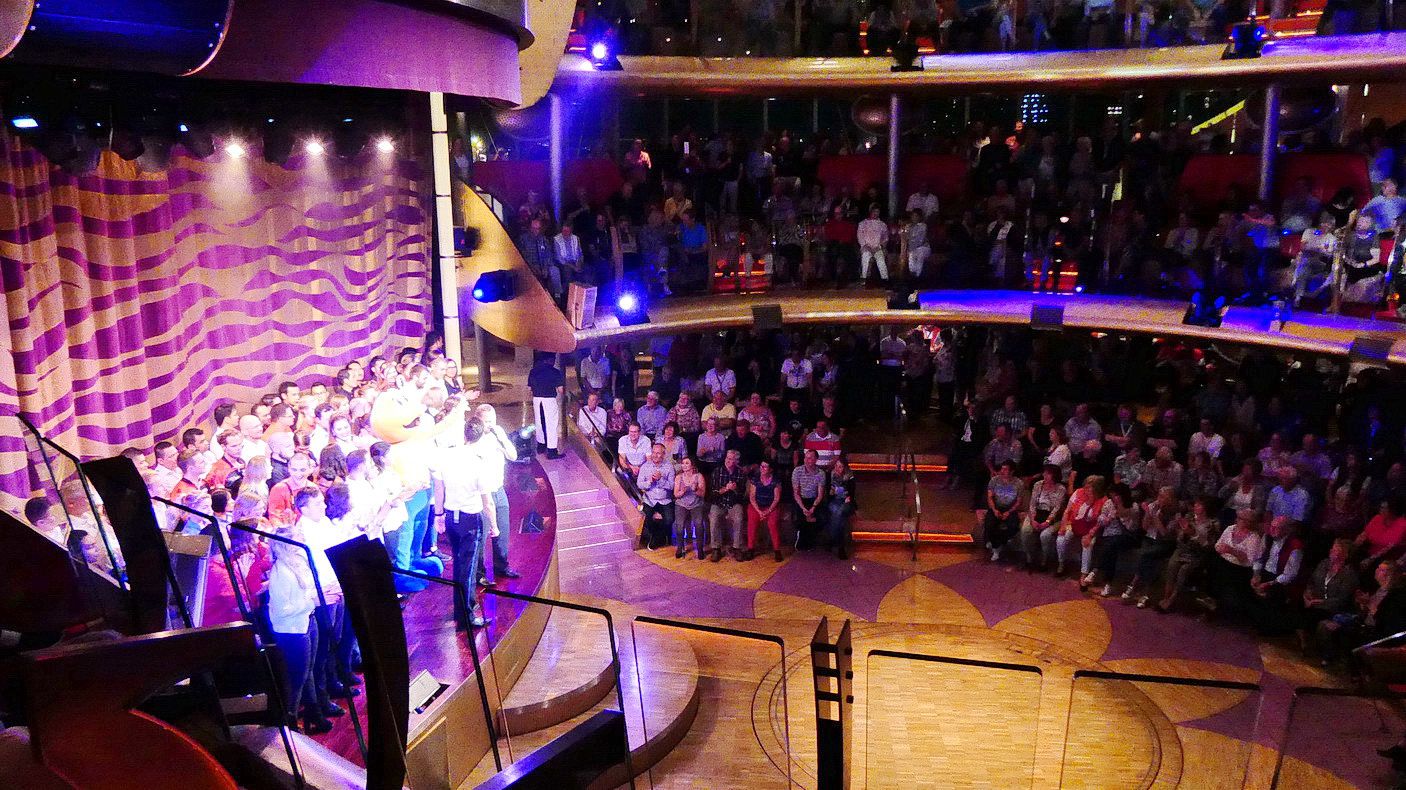 Nach einem lustigen Abendessen gehe ich ins Theatrium zur Welcome Party, während Elke wegen ihres Hustens sich schon auf die Kabine zurückzieht. Ich trinke noch einen Sekt und sehe mir den Anfang der Show an, anschließend kehre auch ich auf die Kabine zurück.