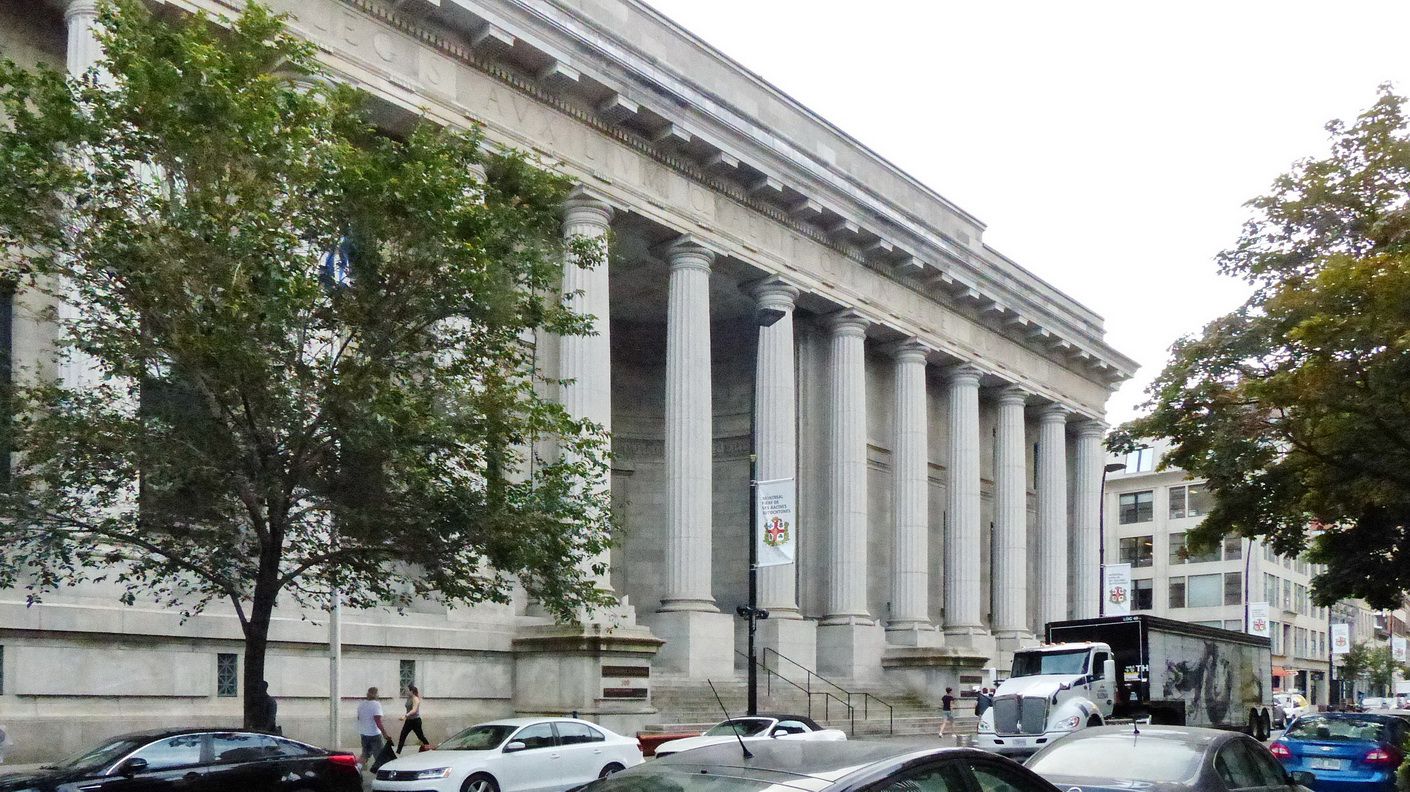 Hinter dem Rathaus befindet sich das Champ-de-Mars, eine große Grünfläche. In der Rasenfläche befindet sich ein 250m langes Stück der Stadtmauer, welches restauriert wurde. Entlang der Rue Notre Dame Est, über die wir jetzt weiter bummeln stehen viele interessante Häuser und offizielle Gebäude. Gleich 3 Gerichtsgebäude stehen an dieser Straße. Der erste Bau, auch als Édifice Lucien-Saulnier bekannt stammt von 1856. Schräg gegenüber steht das Édifice Ernest-Cormier, der 2.Gerichtsbau von 1922. Das heutige Gerichtsgebäude von 1971 steht nicht weit entfernt. In das Gebäude von 1922 kann ich sogar hineingehen und einige Fotos von der sehr imposanten Eingangshalle schießen.