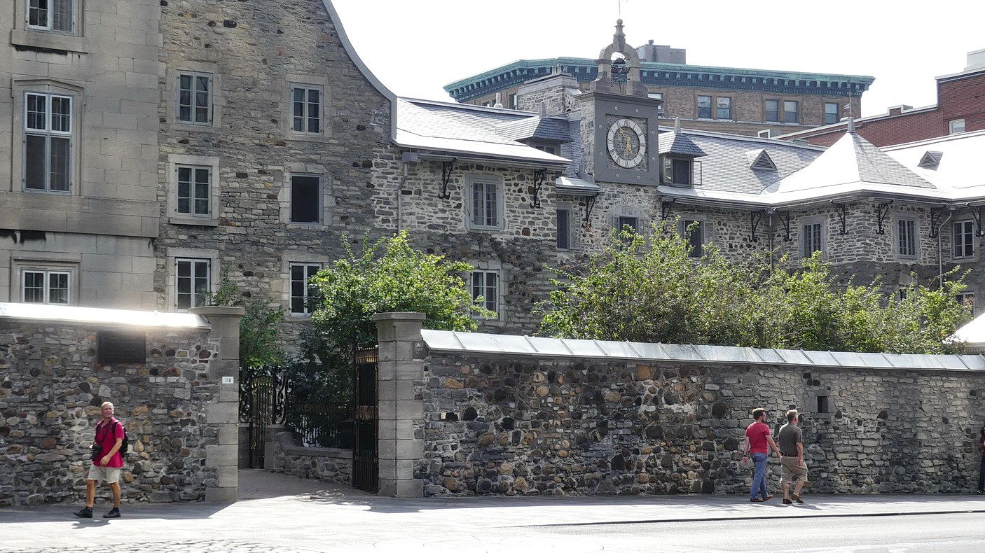 Also gehen wir in die Bank hinein und dürfen uns ohne Probleme überall umsehen. Die Inneneinrichtung der Bank ist überwältigend. Sie ist im neoklassizistischen Stil mit vielen Säulen, einer Statue und dekorativen Leuchten ausgestattet, beeindruckend. Wir können auch überall fotografieren. Lediglich Bilder der Schalterhalle sind, u.a. wegen der Kunden, nicht erwünscht. Schon der Eingangsbereich sieht aus wie ein korinthischer Säulengang und erinnert an einen Tempel der Antike. So ähnlich sieht auch die großzügig gestaltete Schalterhalle aus.Wir werfen noch einen Blick auf die ehem. National Bank of Canada von 1870 und die Banque du Peuple von 1873, die heute zusammen das Hotel Place d'Armes bilden. Vorbei an weiteren schönen alten Häusern kommen wir zum "Alten Seminar von St. Sulpicius" (Vieux Séminaire de Saint-Sulpice) Das Gebäude wurde zwischen 1684 und 1687 erbaut und ist somit das älteste erhalten gebliebene Gebäude der Stadt. Hier wurden Priester ausgebildet.