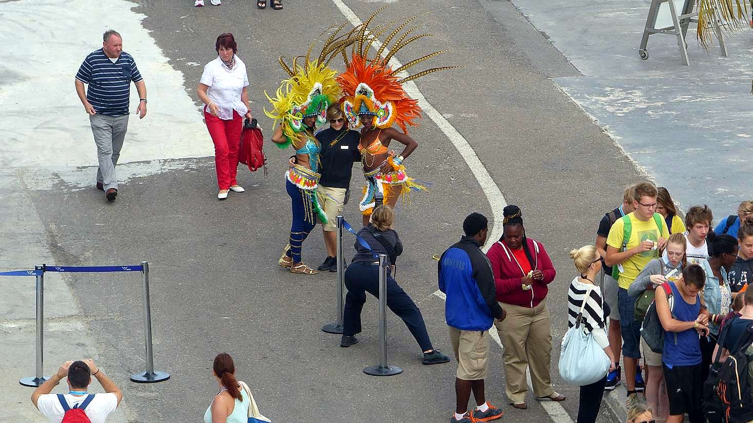 Aber bleiben wir bei der Reihenfolge der Ereignisse. Nach einer ruhigen Nacht hat uns heute früh die etwas "rollende" Aidaluna geweckt. Nahe der Insel New Providence und bei langsamer Fahrt machen sich die Wellenbewegungen eben doch etwas stärker bemerkbar. Es ist inzwischen 6 Uhr 30 und die Aidaluna nähert sich dem Hafen von Nassau / Bahamas. Langsam dreht Kapitän Thomas Mey das große Schiff um 180 Grad damit es für die Ausfahrt gleich wieder in Fahrtrichtung liegt. Vorsichtig bugsiert er uns dann rückwärts an die Anlegestelle und um 8 Uhr liegen wir fest am Kai.