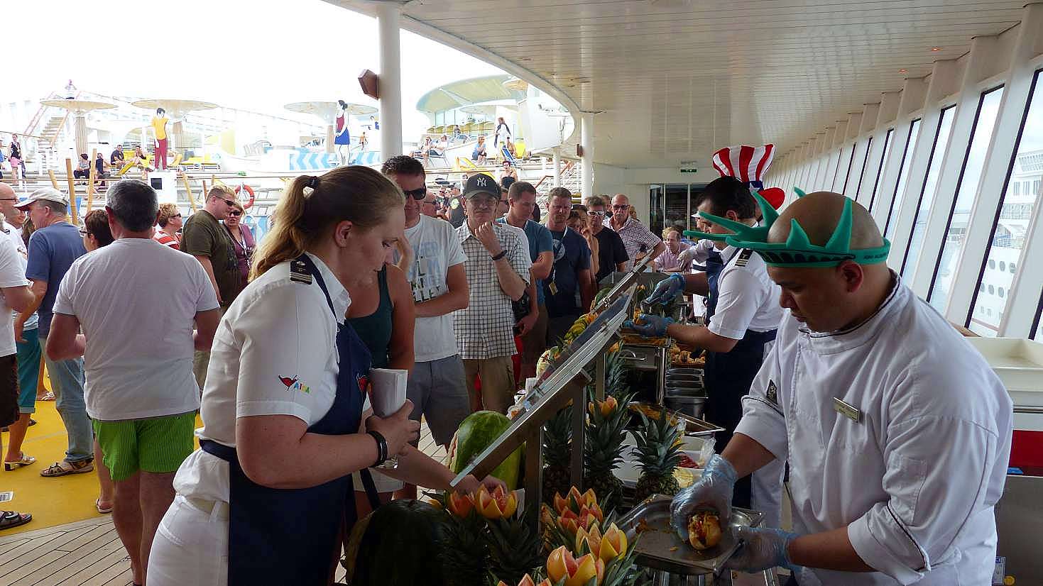 Auf dem Pooldeck findet um 13 Uhr 30 die "Bahama Mama Beach Club Grill Party" statt. Wir sehen uns das Treiben eine Weile vom Deck 12 aus an. Dann entdecke ich, dass Bratwürstchen im Brot als besondere Spezialität kostenlos verteilt werden. Das kann ich mir nicht entgehen lassen. Kristina, die Entertainmentmanagerin verteilt höchstpersönlich die fertigen Hot Dogs: 2 kleine Rostbratwürstchen, Sauerkraut, Senf und Mayo, sehr lecker.