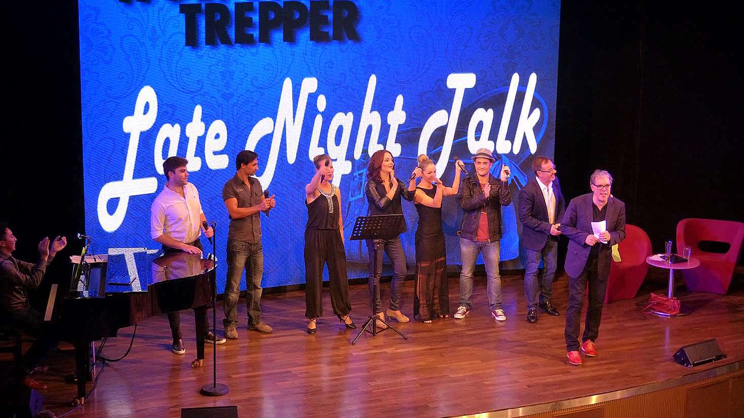 Die Show beginnt mit einleitenden Worten von Wolfgang Trepper und er reißt auch einige Witze, diesmal sind die Politiker dran. Dann werden wieder einige Künstler des Gesangsensembles vorgestellt, singen ein Lied und werden anschließend noch interviewt. Auch Kapitän Thomas Mey erscheint noch mal auf der Bühne. Er wird interviewt und hat wieder einige lockere Sprüche auf Lager. Eine interessante Veranstaltung die bis 23 Uhr 15 dauert, also mehr als 2 Stunden. Aber das Theater ist außergewöhnlich voll und vielen scheint es zu gefallen. Den Abschluss nach einem gemeinsamen Lied der Künstler bildet eine Volkslied. Angeregt durch Wolfgang Treeper, wird es vom Publikum und den Künstlern gemeinsam gesungen. Der Text des Liedes "Der Mond ist aufgegangen" (stimmt mit der Wirklichkeit überein) wird auf der großen Videowand eingeblendet. Alle singen mehr oder minder intensiv mit. Ein interessanter Abschluss.