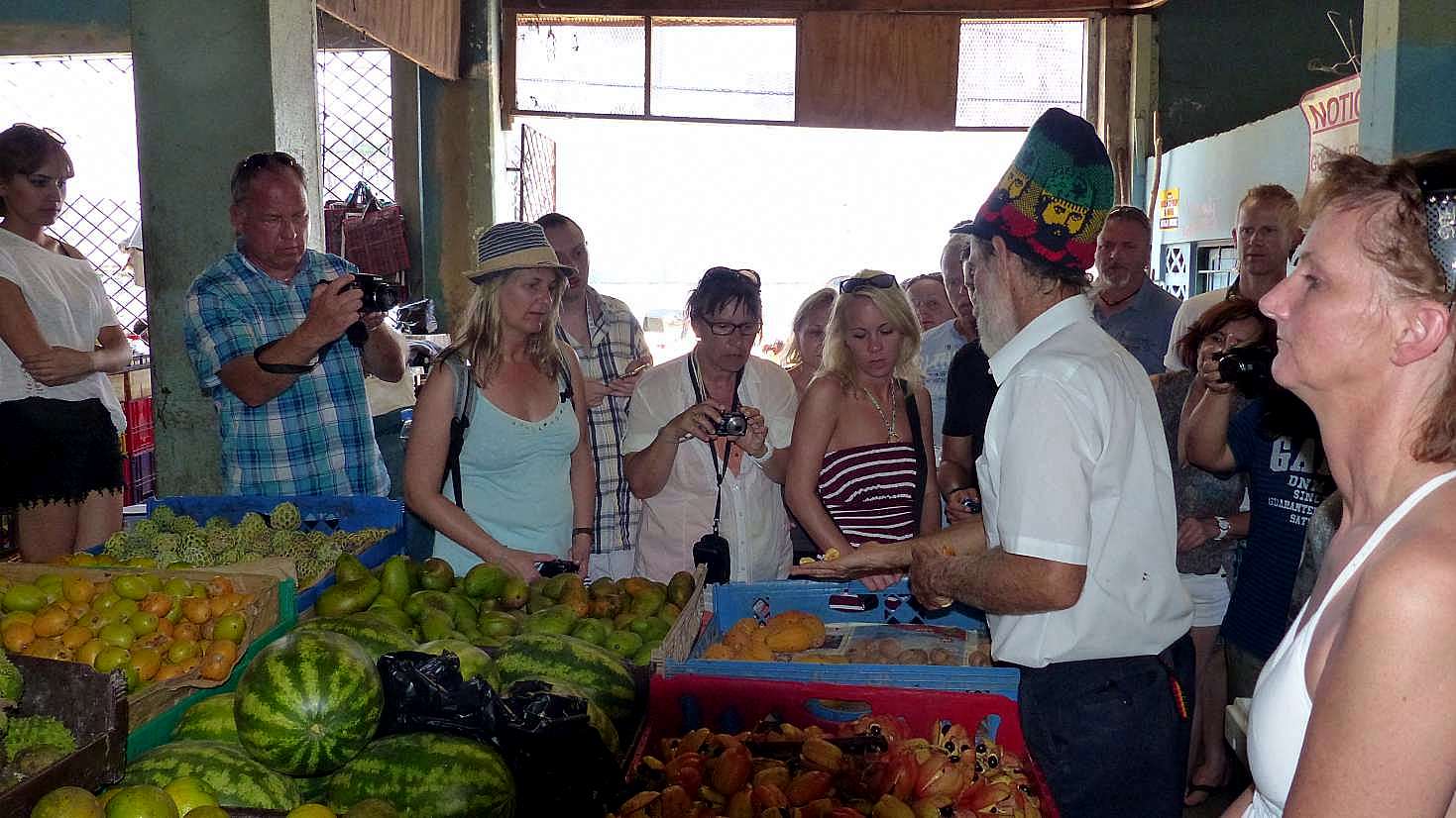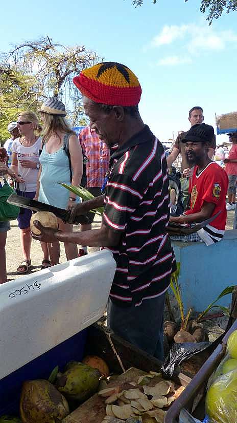 Dann fahren wir weiter nach St. Ann's Bay, der Hauptstadt des Bezirks. Saint Ann's Bay ist übrigens die älteste Siedlung auf Jamaika. Bereits Kolumbus hat sie 1494 auf einer seiner Reisen betreten Wir spazieren durch die Stadt, bummeln über einen Markt und besuchen auch den örtlichen "Busbahnhof". Hier stehen allerdings ausschließlich Taxen, die bestimmte Routen in alle Himmelsrichtungen bedienen und so den "öffentlichen Nahverkehr" darstellt.Man sieht überall in der Stadt, dass hier zwar nicht bittere Armut herrscht, aber die Jamaikaner nicht zu den gut bezahlten Bewohnern der Karibik gehören. Stephen lässt beim "Mexican Men", wie er ihn nennt, einige Kokosnüsse aufschlagen, damit wir das Kokosnusswasser probieren können. Viele sind erstaunt, dass es nicht süß schmeckt. Wir haben es schon einige Male getrunken und wissen dass es eher "salzig" schmeckt. Anschließend werden die Kokosnüsse geknackt, aber sie enthalten nur sehr wenig bzw. gar kein Fruchtfleisch. Dann bummeln wir bis zum Bus zurück.