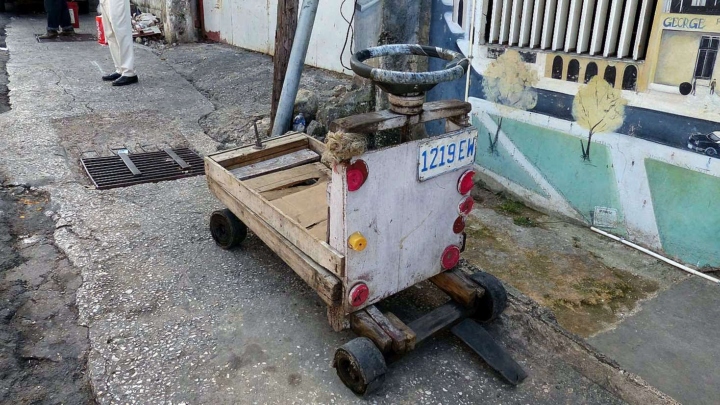 Unterwegs entdecken wir noch einige skurrile Transportgefährte, allesamt Marke Eigenbau. Auch die Stromleitungen sind in einem oberidischen "Chaos" verlegt. Mit unserem Bus fahren wir nach Drax Hall in ein einheimisches Lokal namens "Scotchies". Hier haben wir Gelegenheit einheimische Kost zu essen. Stephen erklärt uns, wie es hier läuft. Man bestellt zunächst an der Kasse, ob man Schwein oder Huhn möchte. Außerdem muss man noch angeben, ob man 1 Pfund, ein halbes oder ein viertel Pfund Fleisch möchte. Ein viertel Pfund soll lt. Stephen reichen. Man kann sich auch in den gleichen Gewichtsklassen eine Wurst des jeweiligen Tieres bestellen. Dazu wählt man noch die Beilage. Wir bestellen uns jeder ein viertel Pfund Hühnchenwurst, als Beilage einmal Manjok-Brot bzw. Festival, ein Teig aus Maismehl mit Muskatnuss und braunem Zucker, welcher in Fett gebraten wird. Alles zusammen mit 2 Eistee kostet 16 US$. Das Wechselgeld gibt ist zum Glück auch US$.