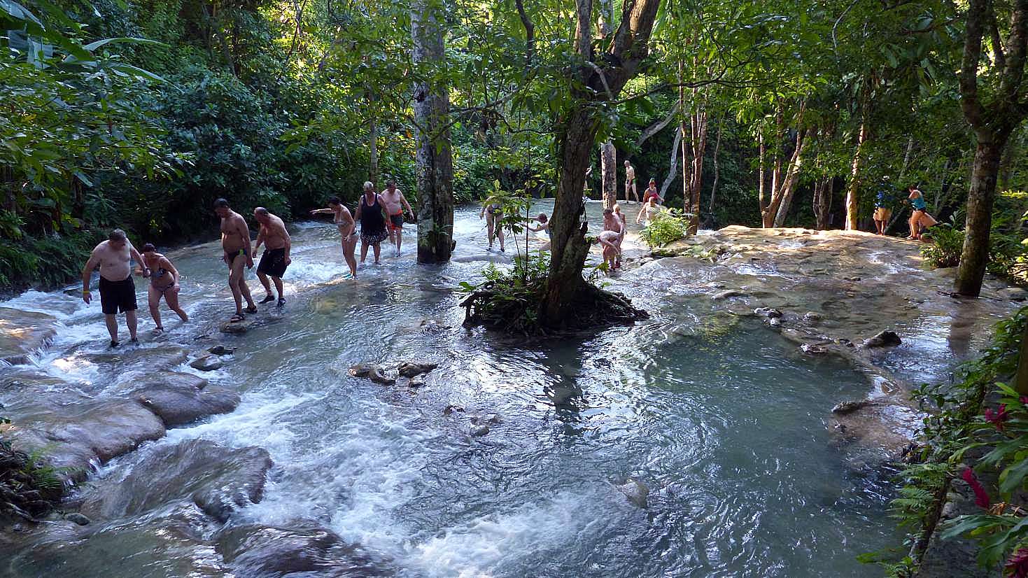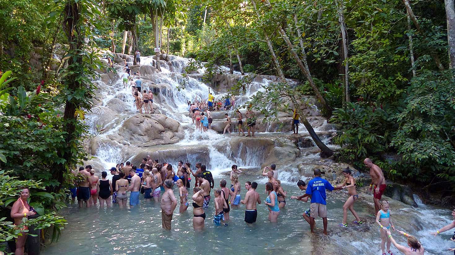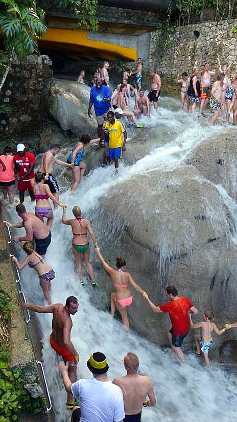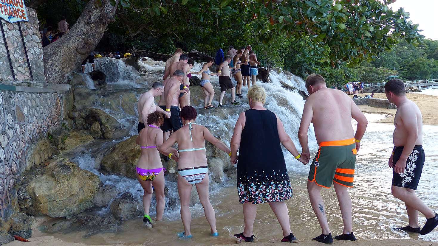 Von hier fahren wir jetzt direkt zu den Dunn River Falls, die wir heute Mittag haben links liegen lassen. Erfahrungsgemäß fahren viele Touristen gleich vormittags dort hin und es ist brechend voll. Jetzt, gegen 15 Uhr wird es langsam leeren. Alle, die die Wasserfälle hochklettern wollen, ziehen sich im Bus schon um. Es gibt auch Toiletten zum Umziehen auf dem Gelände der Fälle. Die meisten haben aber schon auf dem Schiff ihre Badesachen angezogen. Alles Unwichtige bleibt im Bus und wir wandern zur Kasse. Der Eintritt kostet 20US$, den man bar oder mit Kreditkarte bezahlen kann. Dann laufen wir langsam bergab, denn der Eingang zur Anlage liegt am unteren Ende des Wasserfalls am Strand.