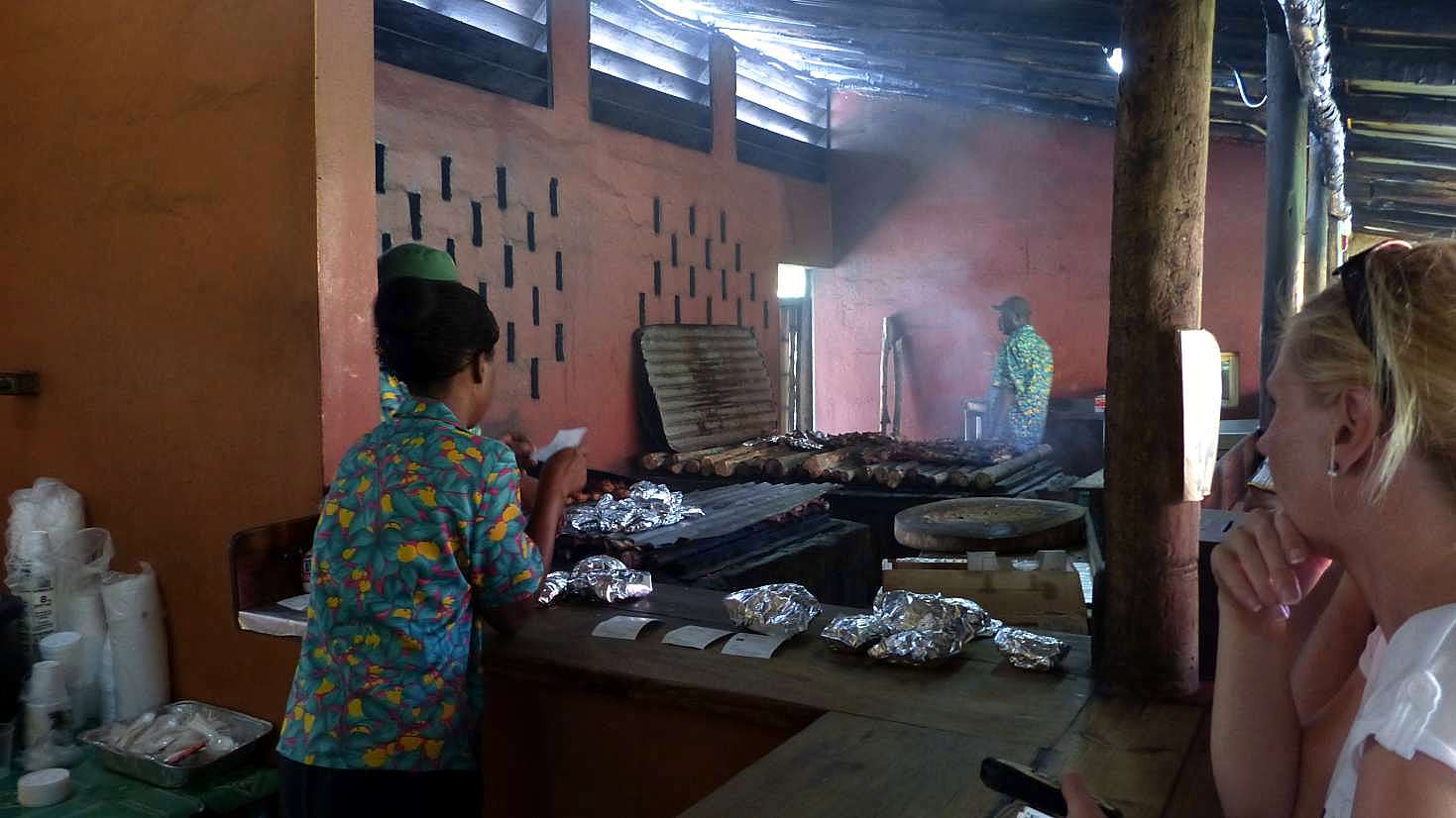 Dann geht man mit seinem Bon zur Ausgabe, direkt an der Küche vorbei. Hier liegen unter großen Wellblechplatten und auf Holzscheiten die fertig gegarten Hühner-, bzw. Schweineteile zusammen mit den entsprechenden Würsten. Bei Huhn oder Schwein kann man sich jetzt noch aussuchen, welches Körperteil man haben möchte. Beispielsweise die Hühnerbrust o.ä., ist alles der gleiche Preis. Alles wird in Alufolie verpackt und zusammen mit den Getränken auf ein großes Tablet gestellt. Wir bekommen auch noch 2 kleine Näpfe in die wir uns Ketchup abfüllen können. Das angebotene Relish sieht nicht so einladend aus. Mit unserem Tablet suchen wir uns ein schattiges Plätzchen im Gartenbereich. Das ganze "Restaurant" ist nett angelegt, viele Plätze im Freien in grüner Umgebung. Das Essen ist nicht schlecht, haut uns aber nicht vom Hocker, vor allen Dingen die Beilagen. Aber wir werden satt davon.