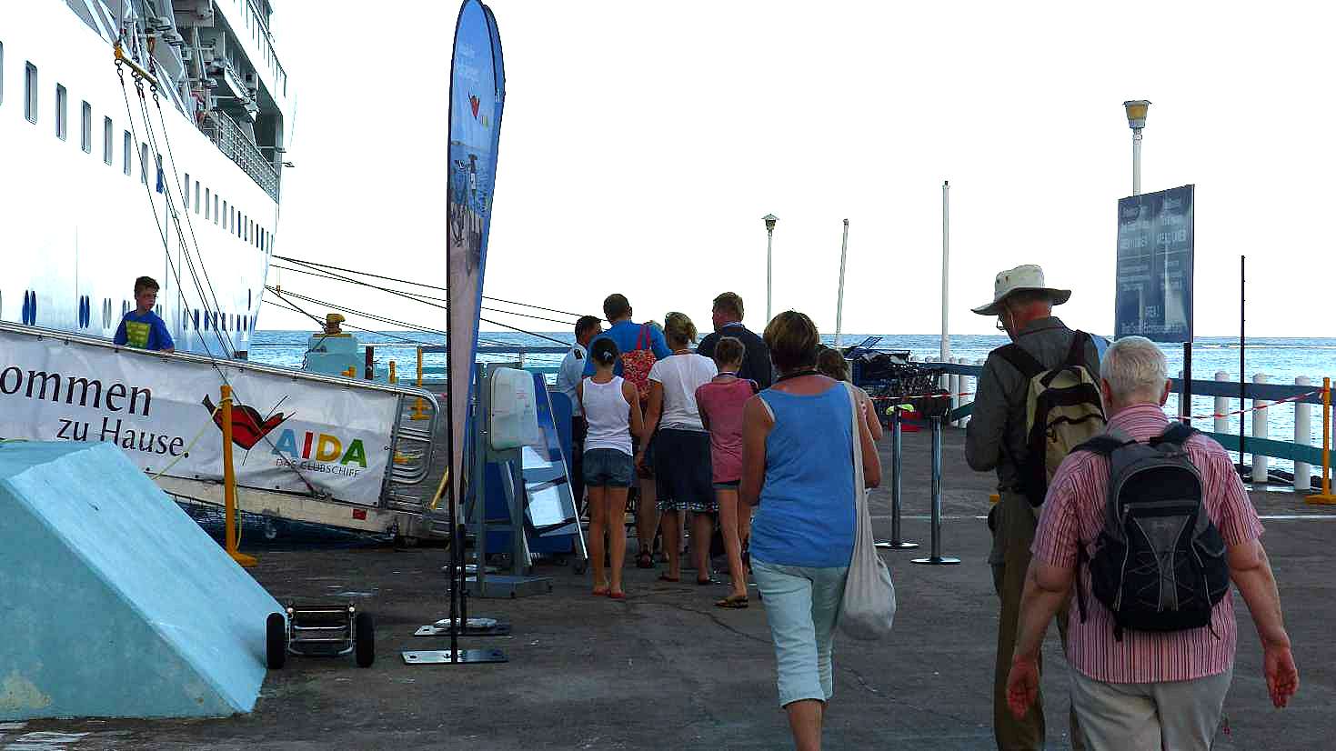 Jetzt sind es nur noch ca. 15 Minuten bis zum Hafen. Hier kassiert Stephen noch die 40 US$ p.P., die der Ausflug mit ihm kostet. Dann verabschiedet er sich von jedem persönlich wir bedanken uns noch bei Vernon, dem Fahrer mit einem "Tip", dann gehen wir ins Hafenterminal. Hier müssen wir unsere Bordkarte vorzeigen und anschließend erfolgt eine "händische" Taschenkontrolle.