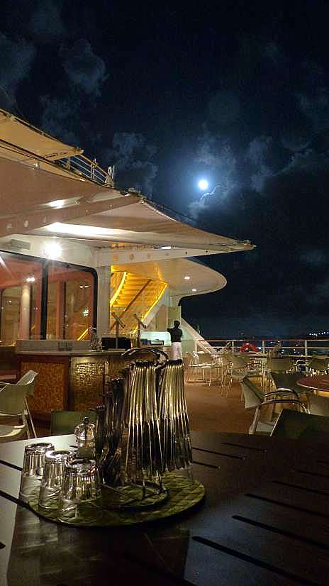 Während wir später bei Abendessen im Außenbereich des Weite Welt Restaurants sitzen, legt die Aidaluna um 19 Uhr in Ocho Rios ab. Der Fast-Vollmond scheint auf uns herab und wir genießen die Wärme und das leckere Abendessen. Später sehen wir uns erneut die Prime Time Show an und sichern uns Plätze für die 21 Uhr-Show des Zauberkünstlers Jochen Stelter. Er hatte tolle Tricks auf Lager, aber seine Art liegt uns nicht so richtig. Während der Show genehmigen wir uns wieder 2 Cocktails, so langsam schrumpft unser Paket, aber wir haben noch einige Gutscheine auf Lager. Bei der Shopping-Night im Aida Shop, wo es auch ein Foto-Shooting mit dem Kapitän Thomas Mey geben soll, ist es schon ziemlich voll.