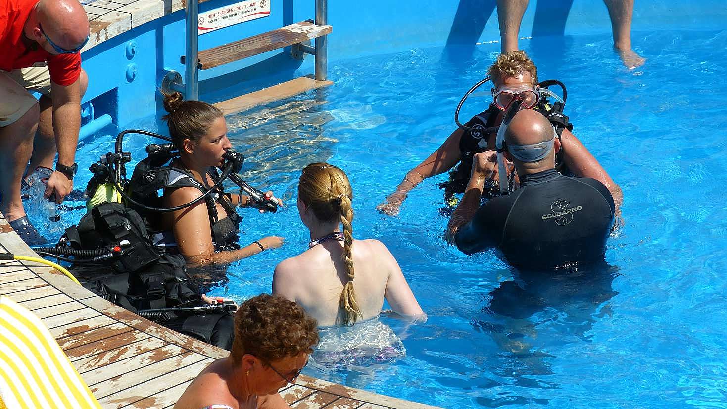 Als ehemalige Taucher wollen wir uns heute mal das Schnuppertauchen auf der Aidaluna ansehen. In dem kleine Pool auf Deck 11 wollen mehrere Frauen es mal ausprobieren. Ihnen werden die Flaschen angelegt, dann drückt sie der Tauchlehrer sanft unter Wasser. Bei der geringen Wassertiefe würde das ohne Hilfe sonst nicht funktionieren. 2 Runden im Pool, das war's. Für denjenigen, der so etwas noch nie gemacht hat, eine gute Gelegenheit mal ins tauchen reinzuschnuppern.