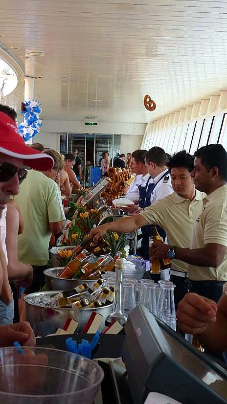 Parallel zum Schnuppertauchen findet der Bayrische Frühschoppen mit Weißwürsten und Bier statt. Viele nutzen die Gelegenheit zwischen Frühstück und Mittagessen noch eine Kleinigkeit zu sich zu nehmen.Später gehen wir in die Pizzeria, wo ich ein kleines Stück mit Schinken probieren. Elke nimmt sich auch einige Teile. Im Bella Vista setzen wir dann unser Mittagessen fort. Ich genehmige mir eine kleine Portionen Nudeln und dazu wieder einen Tee. Vom Fenster aus können wir die ganzen Zeit über einer Truppe von Tölpeln beim fischen zusehen. Immer wieder stürzen sie sich in die Fluten und tauchen kurz danach auf. Ob sie erfolgreich waren können wir nicht erkennen. Von Deck 5 aus beobachten wir sie noch eine ganze Weile, dann gehen wir wieder in unsere Kabine.
