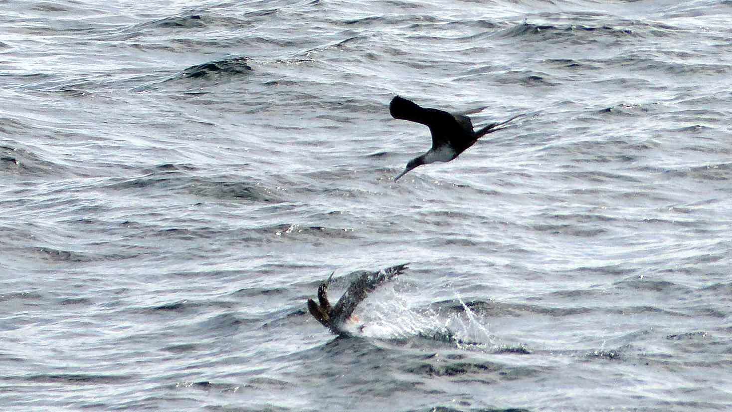 Im Laufe des Tages können wir auf unsere Seite beobachten, wie sich ein Fregattvogel unter die Tölpel mischt. Es versucht dem einen oder anderen die Beute abzujagen, scheint aber nicht erfolgreich zu sein.