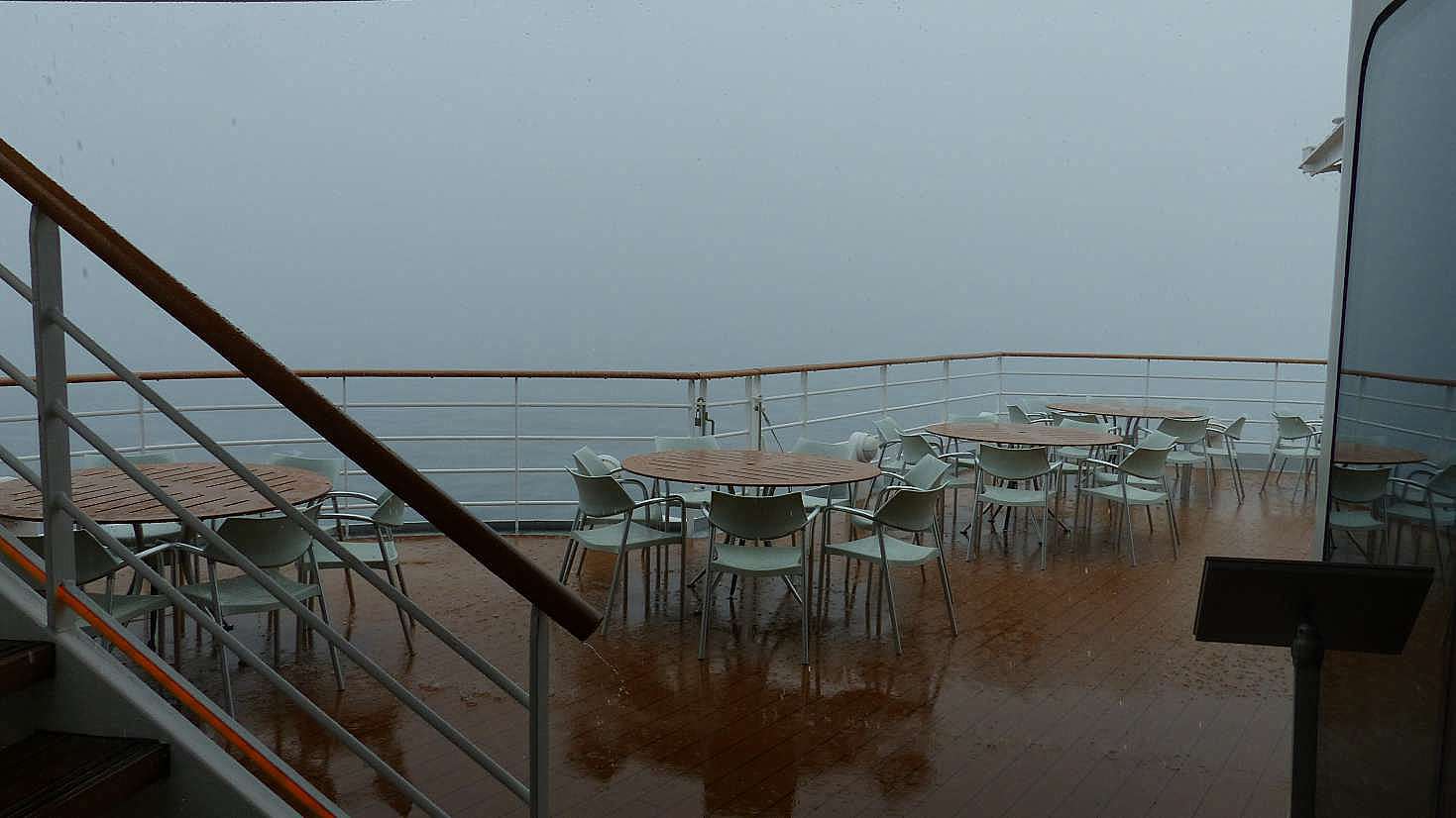 Dann fängt es an zu regnen. Wir fahren direkt in eine riesige graue Wolke hinein, aus der es Augenblicke später heftig regnet. Das Sonnendeck ist in kürzester Zeit leergefegt.So können wir bei "Kaffee und Kuchen" nicht wie gewohnt draußen sitzen. Ein Stück trockener Kuchen sollte mir nicht schaden. Anschließend bummeln wir noch ein wenig durch das Schiff und schießen einige Fotos. Am Ausflugscounter erkundigen wir uns noch nach Ausflügen in Antigua, hier haben wir bisher noch nichts geplant.