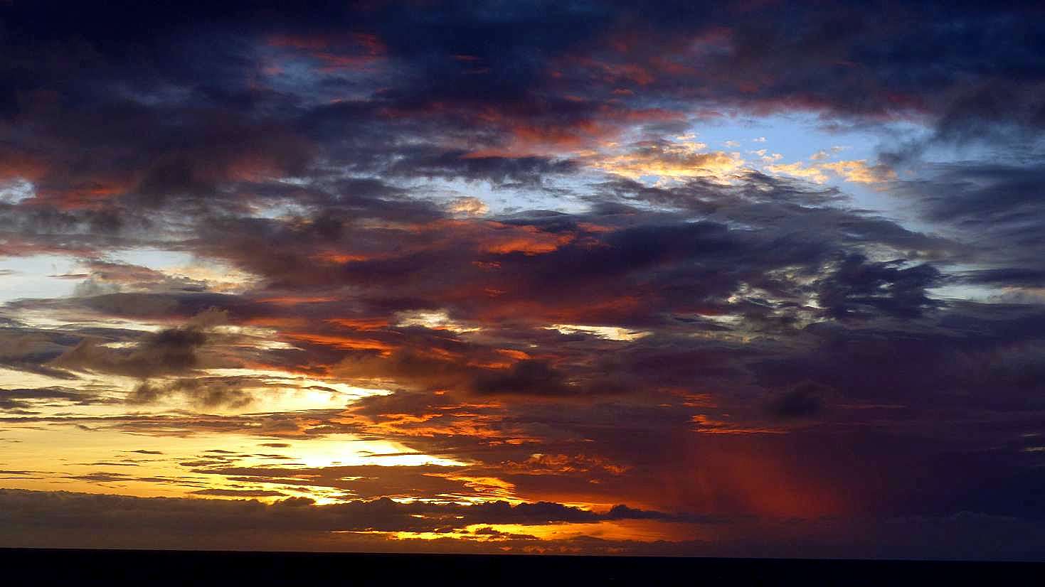 Gegen 18 Uhr geht die Sonne zwischen Wolkenbergen unter und erleuchtet den Himmel glutrot. Ein toller Anblick. Draußen ist es etwas frischer geworden, aber es sind immer noch 26 Grad, dazu weht ein frischer Wind. So bleiben wir zum Abendessen dass erste Mal wieder seit längerer Zeit im Innenbereich des Restaurant.