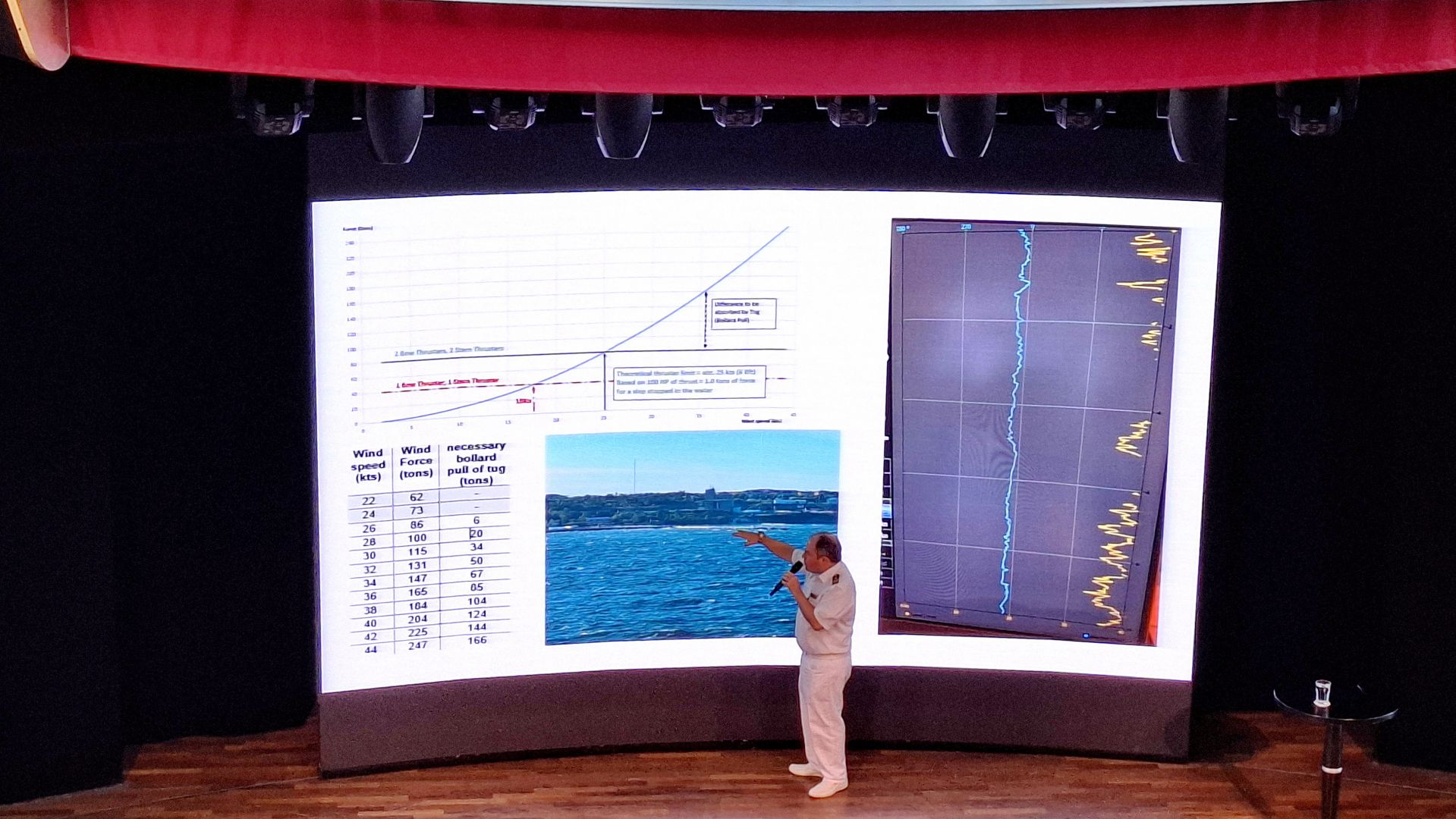 Um 11 Uhr hören wir uns an, was der Kapitän im Theater noch zu sagen hat. Der Wind hätte am Morgen mit über 200 Tonnen auf die Breitseite des Schiffes gedrückt, was die Motoren nicht halten können. Diese können Windgeschwindigkeiten von 25 Knots gerade noch ausgleichen, aber keine 40-45 Knots. Es gibt auch kaum Schlepper, die solche Windgeschwindigkeiten stemmen können und in Visby gibt es überhaupt keinen Schlepper. Außerdem hätte der Wind eventuell auch Wellen auf die Pier gedrückt und wir wären nur mit nassen Füße von/an Bord gekommen. In Kopenhagen liegen wir übrigens zu unserer Freude weiterhin an dem sehr stadtnahen Langenliniekaj, einem sehr schönen Liegeplatz.