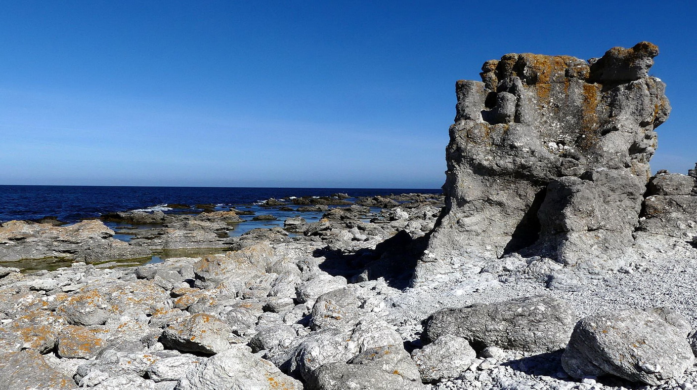 Von hier aus fahren wir zur Westküste der Insel Farö, wo wir in Digirhuvud, einem Naturschutzgebiet, die so genannten Rauksteine an der Küste sehen. Das sind bis zu 10 Meter hohe Kalksteinsäulen, die auf Gotland, aber auch auf Fårö, Lilla Karlsö und auf der benachbarten Insel Öland zu finden sind. Sie entstehen durch Erosion, Auswaschungen und chemische Verwitterung. Wir können uns 20 Minuten lang an der Küste umsehen und diese teilweise bizarren Gebilde fotografieren, dann müssen wir schon wieder weiter.