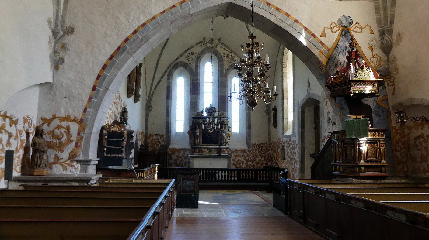 Nachdem wir wieder auf der Insel Gotland zurück sind legen wir noch einen Stopp an der Kirche von Bro ein und besichtigen sie. Der Turm der Kirche stammt noch von etwa 1200, alle anderen Teile wurden überwiegend im 13. Jhdt. erbaut. Die Malereien im Inneren der Kirche, die sehr schön aussehen, stammen von 1686. Unter dem heutigen Holzfußboden kann man an einer Stelle noch einen wesentlich älteren Holzfußboden sehen. Gunnar bringt uns wieder viel über die Kirche und ihre Geschichte bei. Anschließend haben wir Zeit die Kirche selber zu besichtigen.