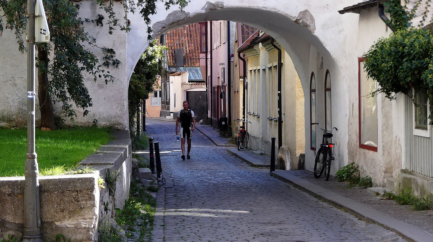 Wir betreten die Altstadt von Visby durch das Dalmanstornet. Nächstes Ziel ist die Domkirche von Visby (ursprünglich Sankt-Maria-Kirche) aus dem 12. Jahrhundert. Sie ist die einzige verbliebene mittelalterliche Hauptkirche der alten Hansestadt Visby. Ein beeindruckender Bau, den wir auch von innen besichtigen. Außen an der Kirche sieht man noch Windenhaken, an denen Ware auf den Lagerboden der Kirche während der Hansezeit hinaufgezogen werden konnte. Von der Kirche aus können wir auch die Ruinen weiterer Kirche sehen, von denen ehemals 14 in der Stadt existierten.