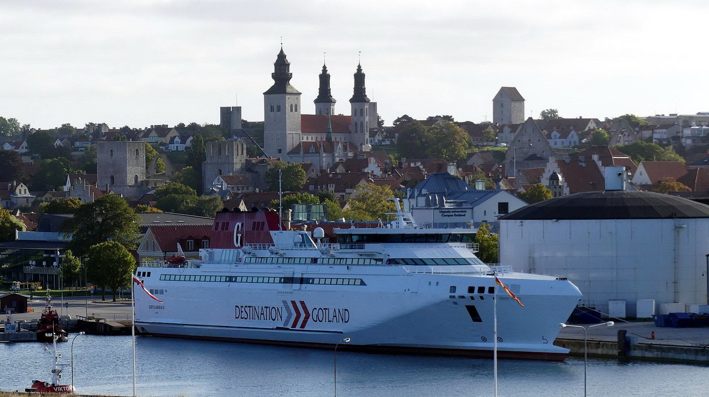 Schon bei der Anfahrt auf den Hafen von Visby sind Steilklippen zu sehen. Im Hafen liegen einige große Fähren. Alles wird aber von den Türmen des Dom zu Visby (ursprünglich Sankt-Maria-Kirche) aus dem 12. Jahrhundert überragt. Die Aidavita liegt in Visby an der Berth No.7.