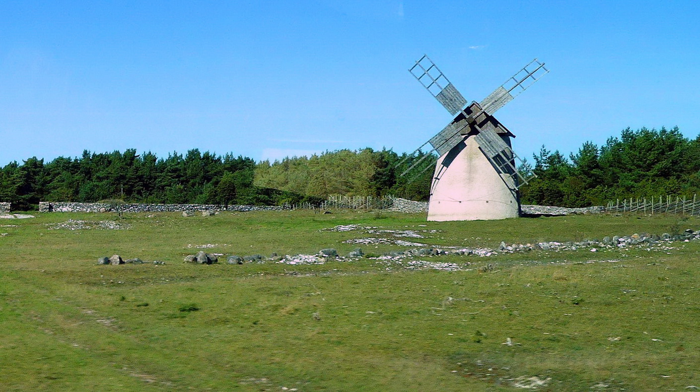 Wir fahren zurück zur Fähre, vorbei an einer schönen Landschaft mit vielen kleinen Mäuerchen aus Feldsteinen. Auf Farö und Gotland sieht alles sehr aufgeräumt aus. Am Fähranleger haben wir etwas Zeit und können noch einige Bilder der sehr schönen Landschaft und einer weiteren Mühle neben der Strasse schießen. Das Wetter heute ist so toll, strahlender Sonnenschein, und 22 Grad.