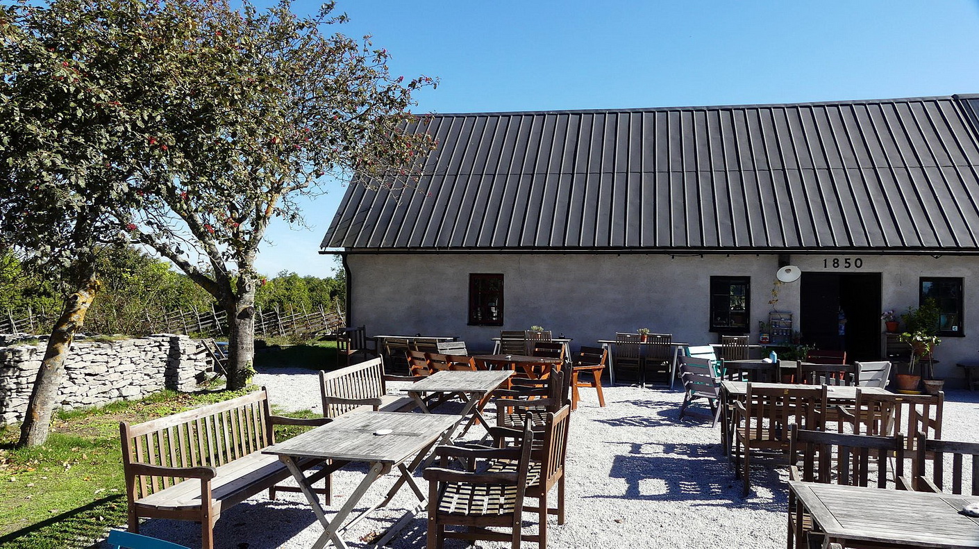 Alles klappt ohne Probleme. Vorbei an der Kirche von Fårö und entlang von vielen Steinmäuerchen (typisch für die Insel) erreichen wir die Pension Fårögården mit Restaurant. Hier werden wir unseren Imbiss (lt. Programm) einnehmen.