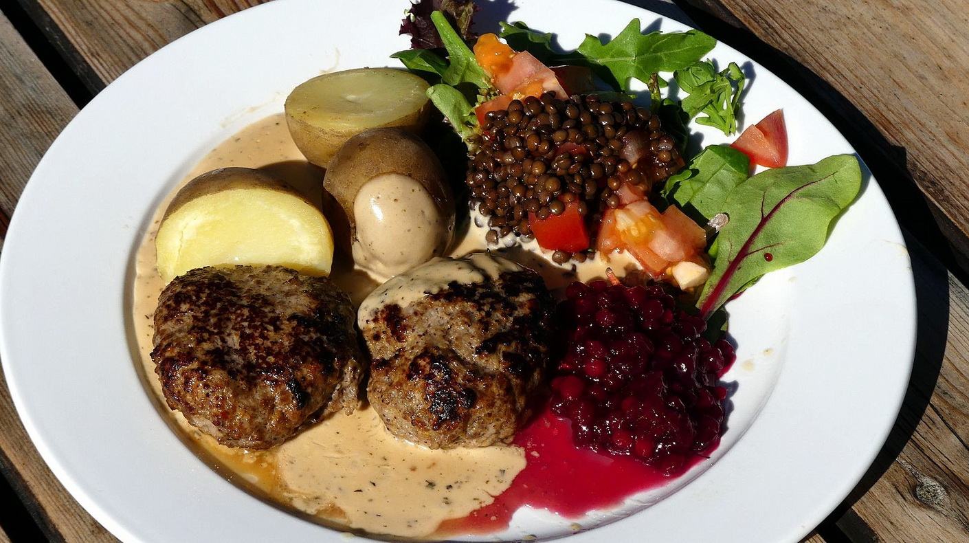 Bei strahlendem Sonnenschein können wir sogar im Freien bei ca. 21 Grad unser Essen einnehmen. Es gibt 2 Bouletten aus Schaffleisch, dazu selbst gepflückte und eingemachte Preiselbeeren, Tomaten, Linsen, Kartoffeln und eine leckere Soße. Wir sind alle sehr überrascht über diesen leckeren "Imbiss". Dazu kann man noch entweder Selters oder Bier (2,2%) als Getränk (inklusive) auswählen.