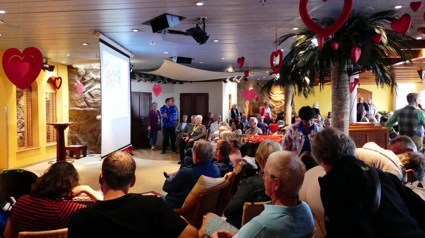 Kurz nach 14 Uhr bildet sich am Poolgrill eine sehr lange Schlange. Alle haben scheinbar Lust auf Hamburger, die wirklich gut schmecken. Gleich anschließend gehen wir in die Nightfly Bar, wo Ralf Eden seinen 2. Vortrag fortsetzt, diesmal geht es um Tallinn. Als wir 15 Min. vor Beginn erscheinen ist die Bar schon rappelvoll. Der Vortragende ist selber überrascht über den großen Andrang, aber er macht seine Sache sehr gut. Wir finden gerade noch 2 etwas unbequeme Barhocker auf denen wir dem Vortrag lauschen, der diesmal 45 Minuten dauert und wieder sehr interessant ist.