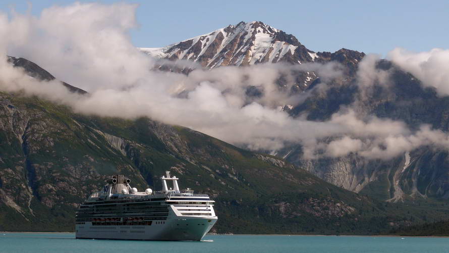Nach etwa 30 Minuten, die wir staunend und erwartungsvoll ( wegen des kalbenden Gletschers) hier verbracht haben, beginnt die Rückfahrt. Immer wieder geht der Blick zurück auf die beiden Gletscher , die langsam hinter uns verschwinden. Während der Rückfahrt sehen wir noch den Reid Gletscher. Ebenfalls mit beachtlichen Ausmaßen, aber auch schon ganz schön angegraut. Auch die übrigen Landschaft hier ist faszinierend. Wie immer kann man so etwas kaum in Worte fassen, einfach ansehen. Und immer wieder sind wir dankbar, dass wir das alles bei so einem Superwetter erleben dürfen. Nicht einen Cent hätten wir bei unserem Abflug auch nur auf einen Sonnenstrahl gewettet. Auf der Rückfahrt wird kostenlos noch jedem eine kleine Suppe angeboten und später gibt es, ebenfalls umsonst, Cookies für jeden. Ein wirklich guter Service an Bord. Während der Rückfahrt können wir erkennen, das die Sonne genau an der Stelle erschienen ist wo die Glacier Bay ihre Höhepunkte zeigt. Ein Blick voraus zeigt, dass das Wetter an unserem Ausgangspunkt besser geworden ist, trotzdem haben hier die Wolken eindeutig die Überhand. Größere wilde Tiere haben wir nicht gesehen, außer einer Schneeziege und mehrmals den Blas eines mehrere hundert Meter entfernten Wals. Aber davon hatten wir ja gestern genug. Unterwegs treffen wir noch einen weiteren großen Kreuzfahrer.