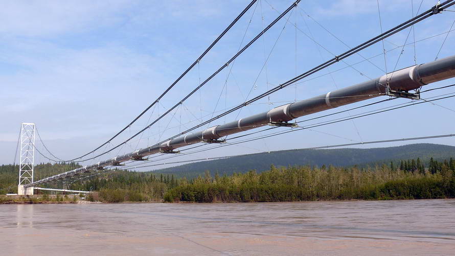 10 Meilen später, die Sonne ist inzwischen ganz hervorgekommen, unterbrechen wir unsere Fahrt. Am Tanana River überquert die Pipeline den Fluss. Man kann hier, direkt am Fluss stehend, die Pipeline sehr schön fotografieren. Strahlend blauer Himmel, so wünschen wir uns das Wetter immer. Das Gelände der Pipeline selber ist hermetisch abgesperrt und mit 2 Zäunen und Sicherheitsein- richtungen geschützt.