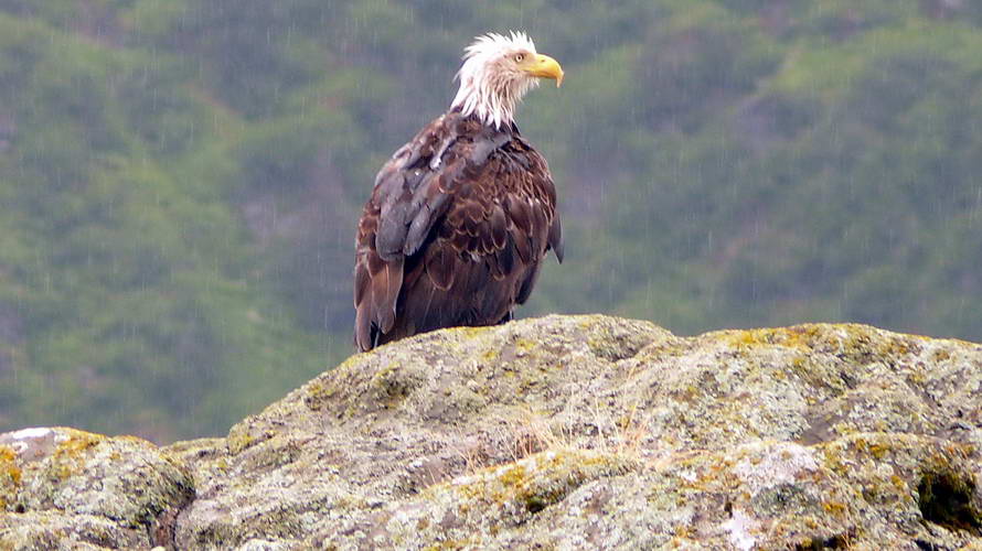 Nach 2 Telefonaten, die wir wegen der Zeitverschiebung immer morgens führen müssen, wandern wir am Hafen entlang. Wir versuchen trotz des Regens der seit unserer Ankunft fällt, wenigstens einige Fotos zu schießen. Bei Kenai Fjord Tours wollen wir schon mal unsere Bordkarten abholen, unser Boot fährt aber erst um 11 Uhr 30 ab. Am Counter erklärt man uns aber zu unserem Erstaunen, das die Tour heute bereits 30 Minuten früher beginnt und wir bereits (es ist 10 Uhr 30) an Bord gehen können. Gut dass wir schon frühzeitig hier sind. Eigentlich wollte ich erst gegen 11 Uhr hier erscheinen, dann wäre das Boot gerade abgefahren. So begeben wir uns also an Bord und können uns, da noch kaum jemand eingestiegen ist, die schönsten Plätze aussuchen. 120 Passagiere werden später an Bord sein.