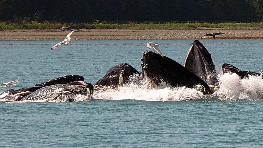 Unser Boot verringert die Fahrt und vor uns dümpeln schon einige kleinere Boote. Wir dürfen jetzt auf das vordere und hintere offene Deck. Wir sind gerade alle dort angekommen, da erfolgt schon ein erster Aufschrei. Zwischen den Booten vor uns brodelt plötzlich das Wasser, anders kann man es nicht nennen. Erst einen Augenblick später erkennen wir, was wir uns absolut nicht vorstellen können. Wir sehen eine Gruppe von Buckelwalen beim Jagen.