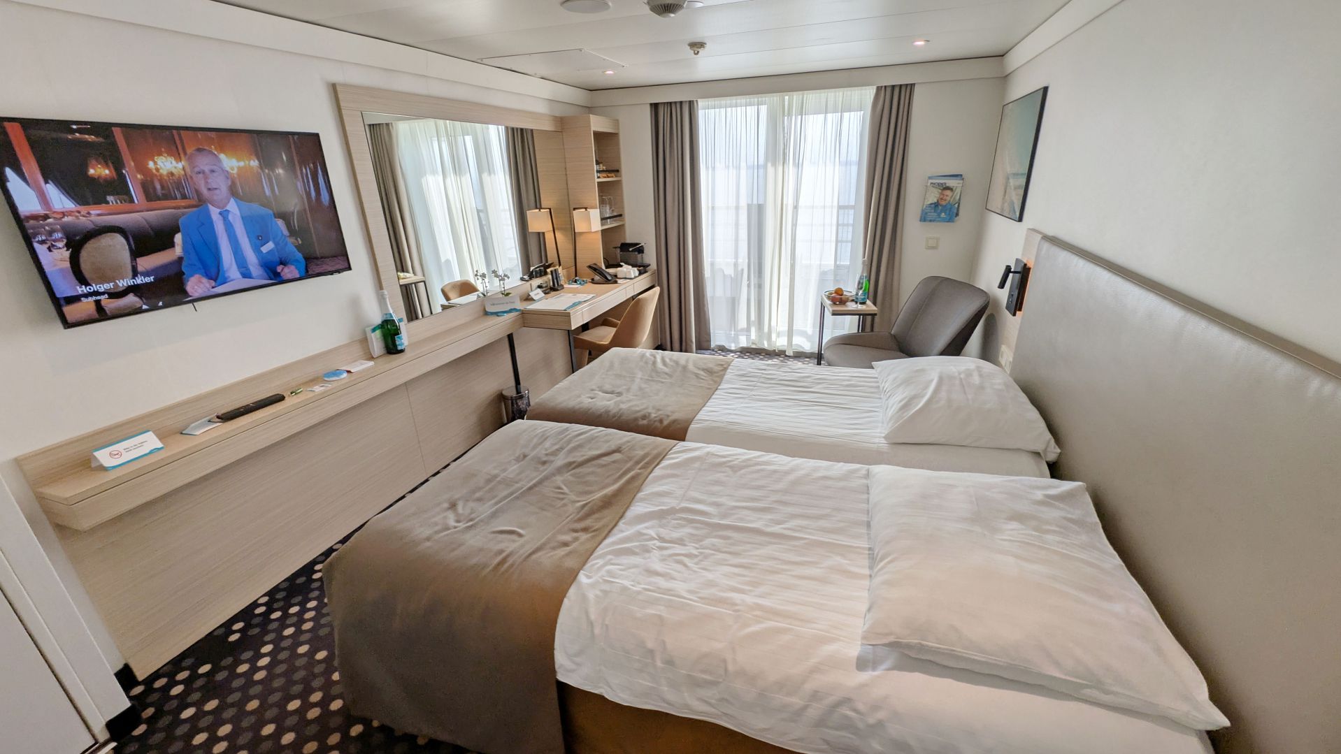 Ich sehe mich zunächst mal in der Kabine um. Diese ist schön groß (24 m²) mit begehbarem Kleiderschrank, einem schönen Dusch-Bad, 2 großen Betten, einem Schreibtisch, einem Fernseher an der Wand, einer Kaffeemaschine (4 Kapseln frei pro Tag), ein gefüllter Kühlschrank (Inhalt gegen Bezahlung), einem schönen Balkon und noch einigem mehr. Es gibt genügend Steckdosen und auch etliche USB-Anschlüsse sind vorhanden. Auf dem Tisch der Sitzecke (1 Sessel) stehen auch noch 2 Flaschen Sekt und einem Obstkorb.