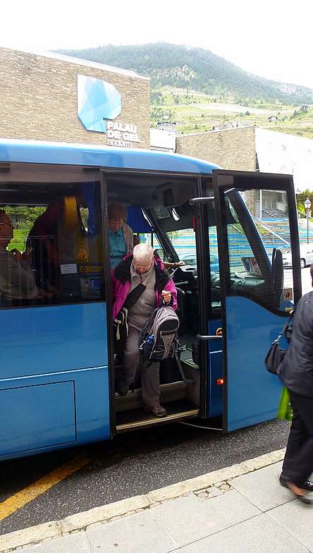 Ich hatte mich vorher schon an der Rezeption nach dem passenden Bus, den Preisen und der besten Haltestelle in Andorra La Vella erkundigt. Gemeinsam warten wir an der Haltestelle, die direkt gegenüber dem Hotel liegt, auf den Bus der Linie 4, der uns für 1,80€ nach Andorra La Vella bringen soll. Wie in Andorra üblich (laut unserer Reiseleiterin) ist der Bus nicht pünktlich, er kommt mit etwa 10 Min. Verspätung. Wir bezahlen beim Fahrer unseren Fahrpreis, erhalten jeder ein Ticket und dann geht's los. Nach etwa 20 Min. erreichen wir den Anfang von Andorra La Vella. Im Bus (zumindest in den größeren) gibt es Signalknöpfe, mit denen man seinen Wunsch zum Aussteigen dem Busfahrer mitteilen kann.