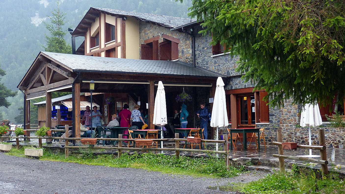 Nach 3 Km erreichen wir den Stausee von Engolasters. Wir sehen ihn zunächst nur durch die Bäume schimmern. Der Stausee ist mit einer Fläche von 800 mal 300 m der größte See in Andorra und sehr beliebt bei Wanderern und Anglern. Unsere Reiseleitung (Jessica) muss noch einige Mitreisende „einfangen“ die sich vor dem Regen in einem Restaurant „verkrochen“ haben. Es ist allerdings nicht das Restaurant, wo wir auf unseren Bus warten wollen. Kurz darauf laufen wir weiter am See entlang, der Regen setzt für kurze Zeit aus und wir erreichen nach einem weiteren Kilometer das Restaurant Camp del Serra, etwas oberhalb des Stausee.
