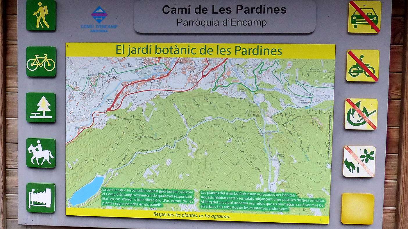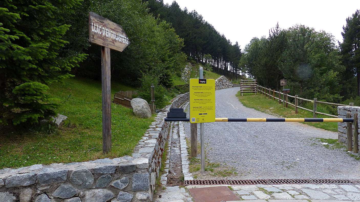 In der Nähe von Encamp verlassen wir an einem Parkplatz den Bus. Hier startet unsere Wanderung auf dem Panorama-Wanderweg Cami de les Pardines . Dieser leichte Wanderweg (ca. 3 Km) führt uns zum Stausee von Engolasters und dann noch ein Stück weiter zu einem nahe gelegenen Restaurant (1 Km), wo uns der Bus wieder abholen wird.Der Weg ist breit und ohne jedes Gefälle. Am Wegesrand stehen in Abständen blühende Pflanzen, die auf Schautafeln näher (außer in deutsch) beschrieben sind. Nach etwa 400 m erreichen wir einen kurzen (ca. 50 m) und breiten Tunnel, den wir bequem durchqueren können.