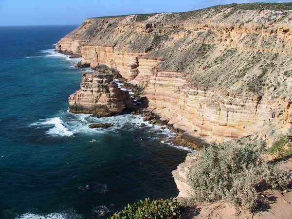 Anschließend fuhren wir direkt zum Kalbarri National Park. Der Murchinson River hat über Jahr- millionen sein Flussbett hier tief in den Boden eingegraben und so ergeben sich tolle Landschaftsfor- mationen in diesem Park. Erster Lookout war am Hawks Head , wo man einen phantastischen Blick in den Canyon werfen konnte. Wir haben dann noch einige andere Aussichtspunkte angefahren, die jedoch nicht so spektakulär waren. Entlang der Küste ging es weiter vorbei an interessanten Forma- tionen wie Red Bluff, Natural Bridge und Eagle Gorge bis nach Kalbarri, einem etwas verträumten Ort.