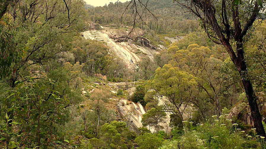 Kurz hinter dem Parkeingang, noch vor der Eurobin Falls Picknic Area, hat man den einzigen freien Ausblick auf den ganz großen Wasserfall. Diese Stelle haben wir glatt verpasst und später nicht mehr daran gedacht. Also aufpassen.