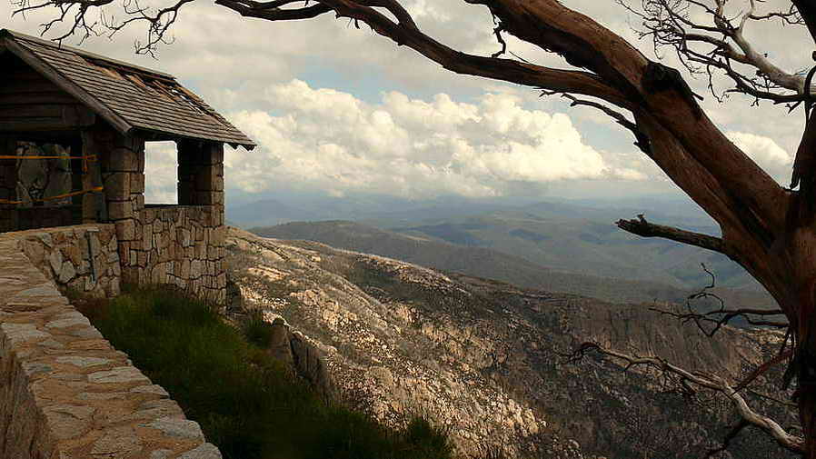 The Horn ist unser nächstes Ziel, die höchste Stelle im Mt. Buffalo National Park. Die Landschaft hat sich inzwischen dramatisch verändert. Riesige Fläche mit abgestorbenen Eukalypten sind in weitem Umkreis zu sehen. Die Ursache ist uns unbekannt. Aber die Vegetation erneuert sich schon. Überall zwischen den riesigen weißen kahlen Bäumen sind kleine, junge Eukalypten zu sehen. In etlichen Jahren sieht das hier alles wieder richtig Grün aus. Die letzten 3 Kilometer sind eine Schotterpiste, aber die nehmen wir in Kauf. Außerdem sind nur sehr wenige Menschen und Autos im Park unterwegs.