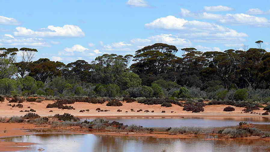 Die nun folgende Strecke auf dem Highway ist sehr abwechslungsreich, jedenfalls für uns. Der Bewuchs wechselt sehr oft von Art und Dichte her, immer wieder tauchen ausgetrocknete Seen oder sehr vereinzelt kleine idyllische Wasserlöcher auf. Unterwegs entdeckt Elke noch an der Straße einen Emu. Kilometerweit sehen wir den Highway teilweise schon vor uns. Über einzelne Hügelketten führt die Straße öfters bergauf und bergab so dass man immer wieder die Landschaft von oben sehen kann.