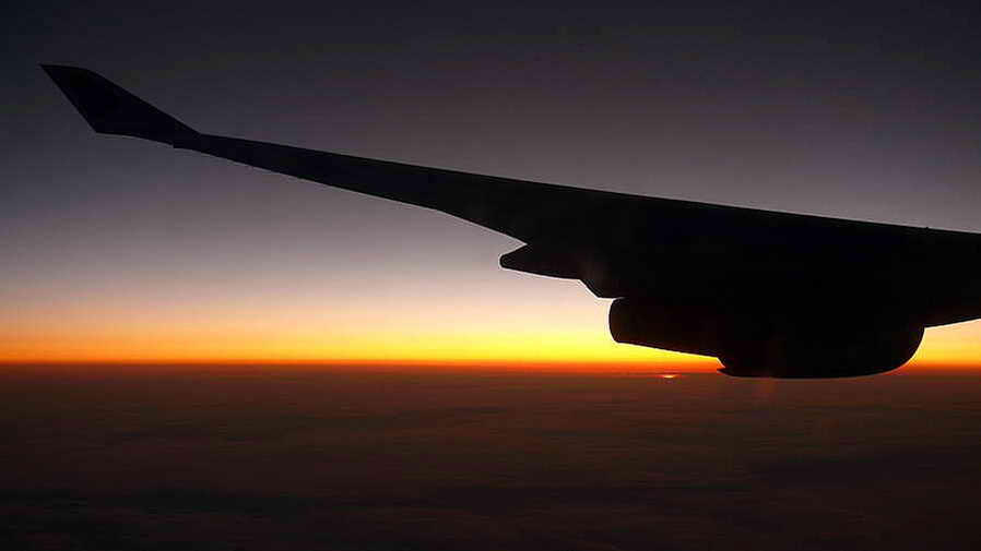 Auf Grund der Flugrichtung haben wir einen schönen langen Sonnenuntergang. Wir sitzen zum Glück auf der richtigen Seite des Flugzeugs, allerdings kann ich wegen des Flügels die Sonne nicht direkt sehen. Aber die Verfärbung des Horizonts ist schon faszinierend. Kurz bevor die Sonne dann völlig verschwunden ist, macht unser Flugzeug noch eine Rechtskurve. Dabei hebt sich der Flügel etwas an und ich kann noch einige tolle Bilder der letzten Zipfel der untergehenden Sonne fotografieren. Inzwischen haben wir unseren 3. oder 4. Spielfilm gesehen. 3 Stunden vor der Landung gibt es dann Dinner. Das Essen schmeckt wieder sehr gut und so vergeht die Zeit relativ schnell.
