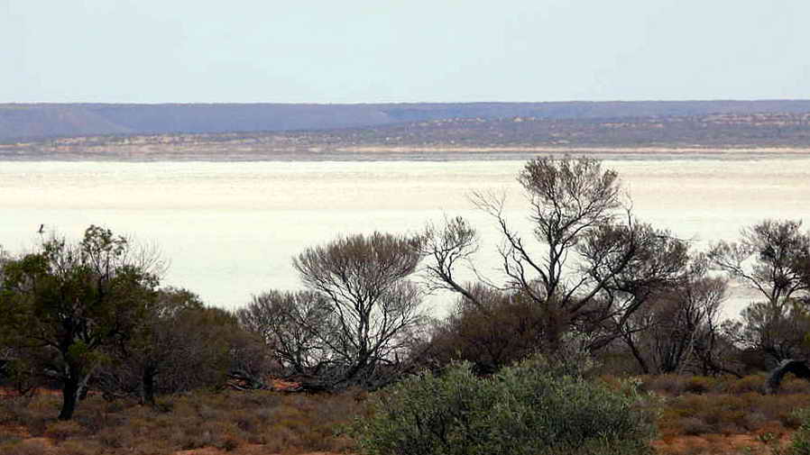An der Straße liegen rechts und links einige Aussichtspunkte, die wir dann auch anfahren. Meistens hat man von hier aus immer einen schönen Blick in die umliegende Landschaft oder z.B. auf den Lake Hart, der aber völlig trocken ist. Die ganze Oberfläche des Sees ist mit Salz bedeckt. Es lohnt sich an jedem gekennzeichneten Aussichtspunkt anzuhalten. Plötzlich sieht Elke während der Fahrt einen Emu am Straßenrand. Wir drehen um, aber als wir den Emu erreichen, flüchtet er mit einem Zweiten weiter weg von der Straße. Die Emus sind ziemlich scheu. Während der weiteren Fahrt haben wir auch noch einen Schakal oder so etwas Ähnliches gesehen. Er lief seelenruhig über die Strasse, hatte aber immer den Verkehr im Blick.
