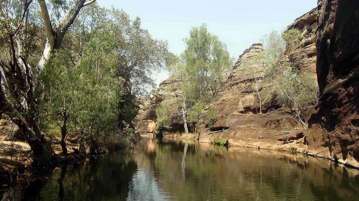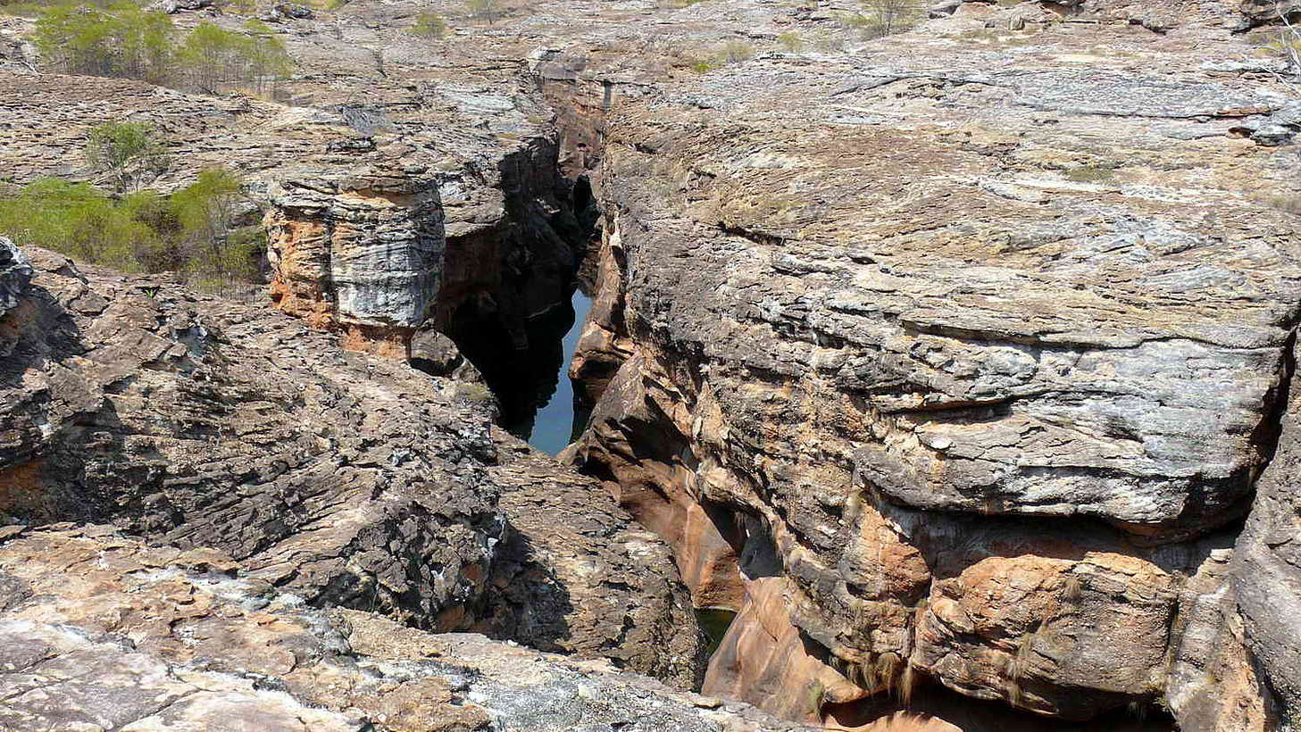 Dort treffen wir auch unseren Guide Jamie, der uns und einigen weiteren Touristen auf der Tour "Cobbold Gorge" begleiten und vieles erklären wird. Mit einem "All-terrain Vehicle" fahren wir um 9 Uhr los und es geht quer durch den völlig trockenen Robinson River bis zur Cobbold Gorge. Dort endet nach ca. 20 Minuten die Fahrt. Von hier aus wandern wir zu Fuß durch die Landschaft bis zum Grab des Pioneers John Corbett, der hier 1871 in der Gegend ums Leben gekommen ist. Über uns zieht, laut kreischend, eine große Gruppe Rotschwanzkakadus (ca. 30 Vögel) über uns hinweg.Ein toller Anblick. Anschließend wandern wir über Stock und Stein bis an den oberen Rand der Cobbold Gorge. Das ist natürlich nicht so Elkes Ding. Sie hält sich lieber etwas vom Rand der Schlucht entfernt. Bis zu 30 m tief unter uns können wir die Schlucht teilweise einsehen, ein wunderbarer Anblick. Wir entdecken sogar eines der Süßwasserkrokodile dort unten im Wasser. Nach etwa 15 Minuten, die wir Zeit haben um diesen Anblick zu genießen, steigen wir wieder zur Schlucht hinunter.